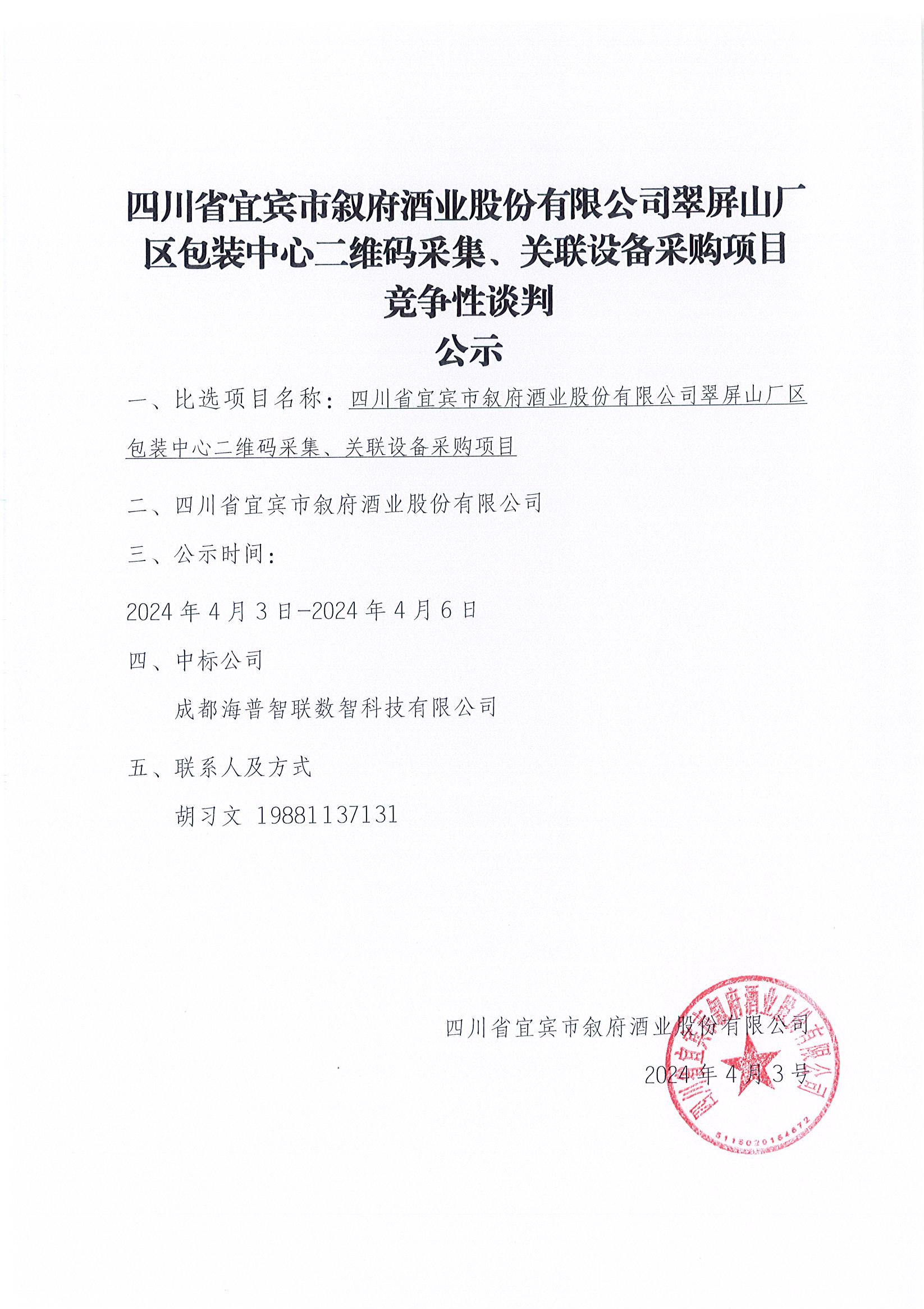 四川省宜賓市敘府酒業(yè)股份有限公司李莊廠區(qū)2024年12月-2025年12月丟糟外包出售競爭性談判項目結(jié)果公示