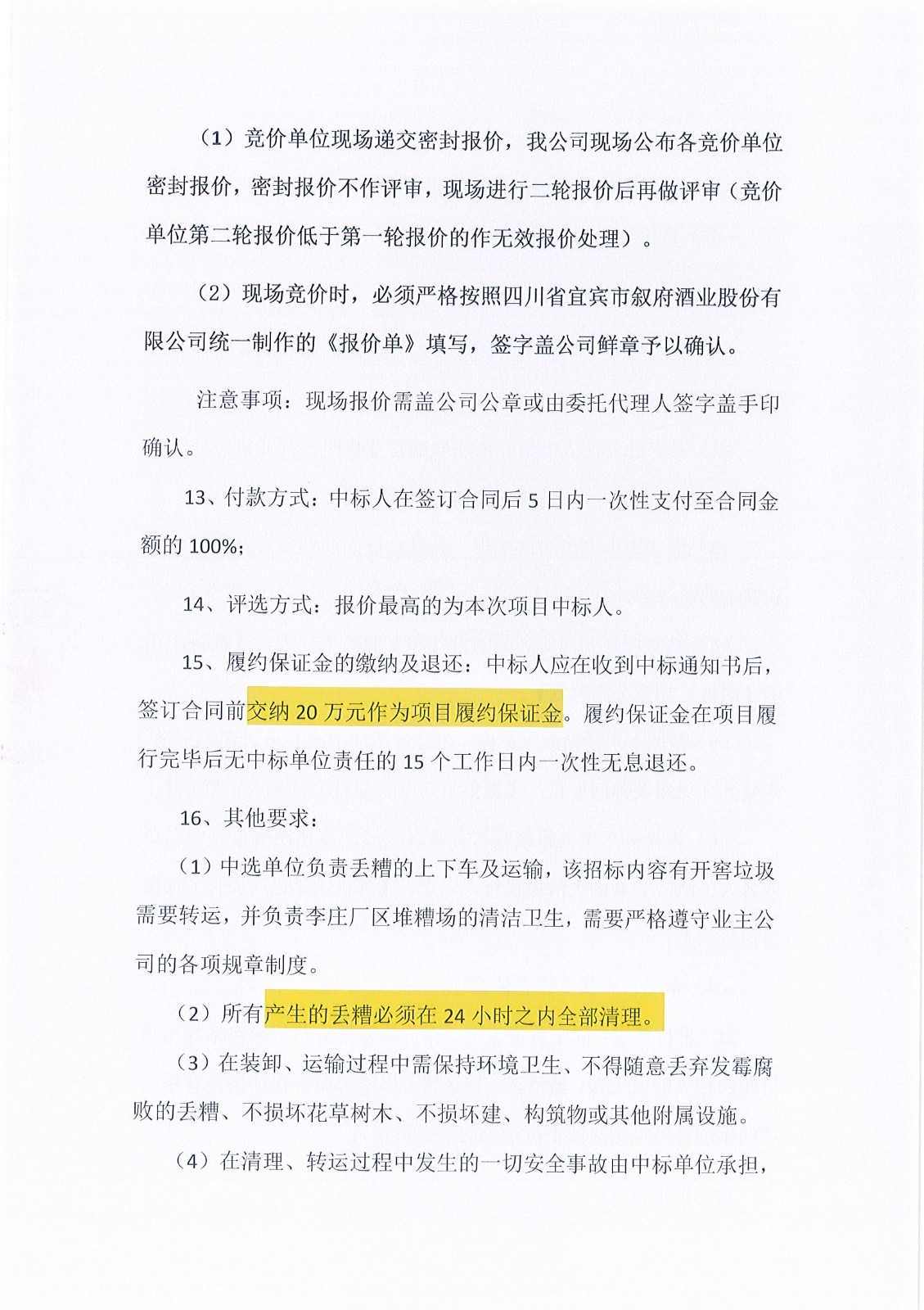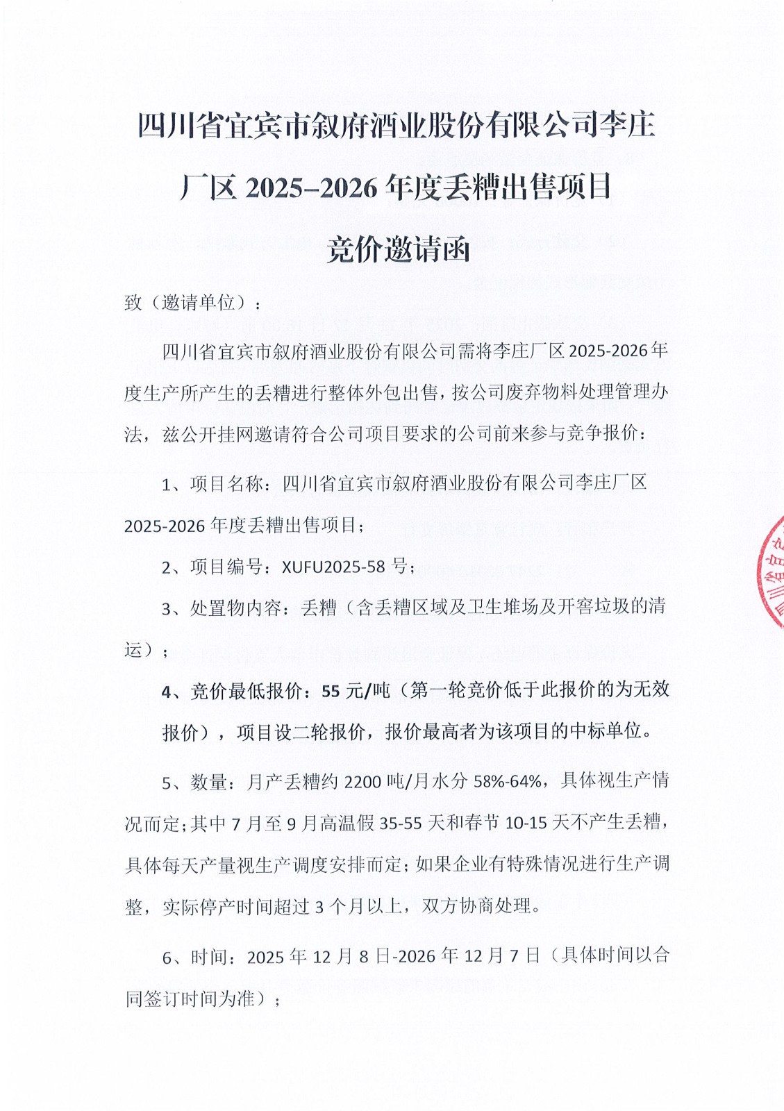 四川省宜賓市敘府酒業(yè)股份有限公司李莊廠區(qū)2025-2026年度丟糟出售項目競價結果公示公告