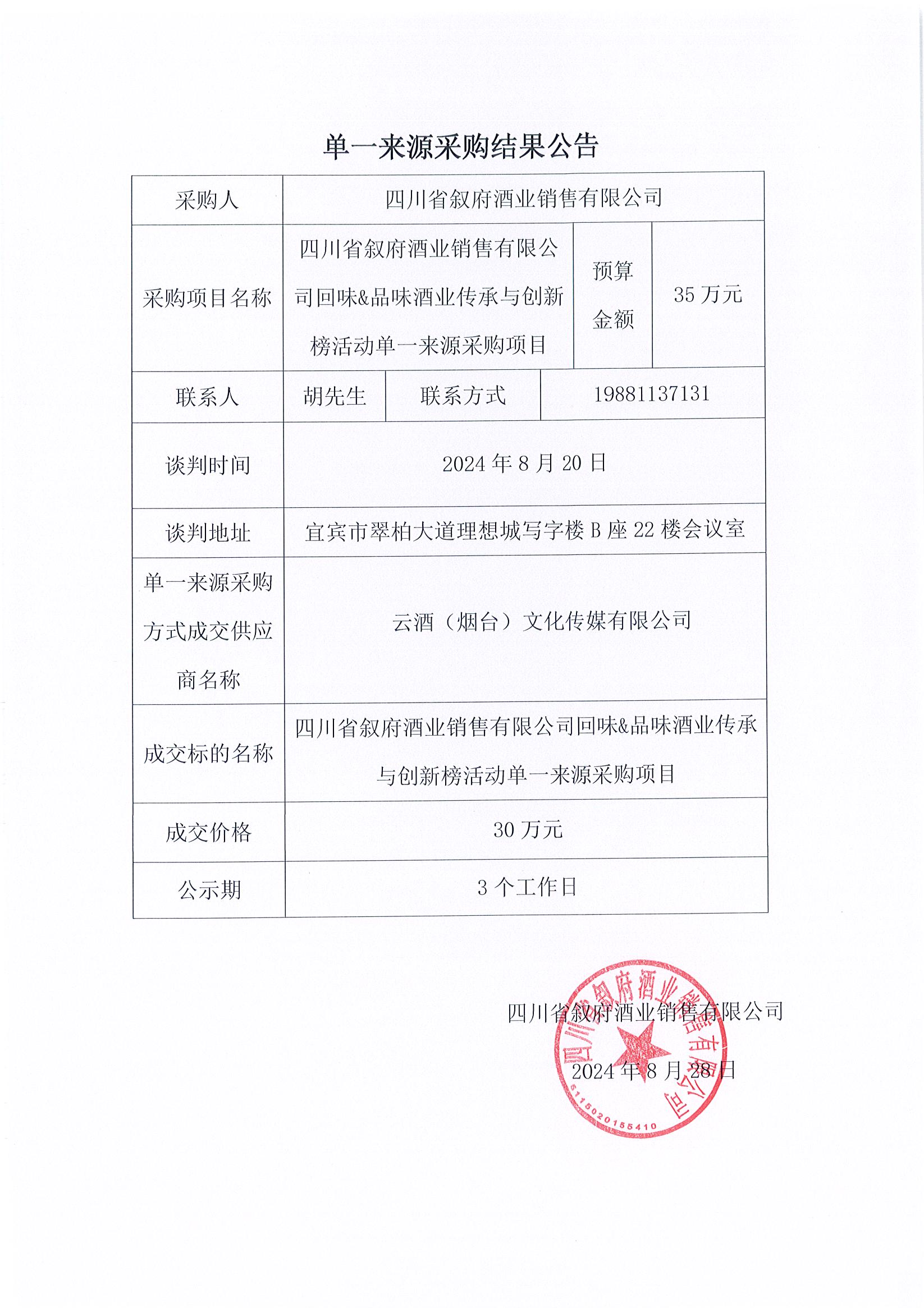四川省敘府酒業(yè)銷售有限公司回味&品味酒業(yè)傳承與創(chuàng)新榜活動(dòng)單一來(lái)源采購(gòu)項(xiàng)目中標(biāo)結(jié)果公示公告
