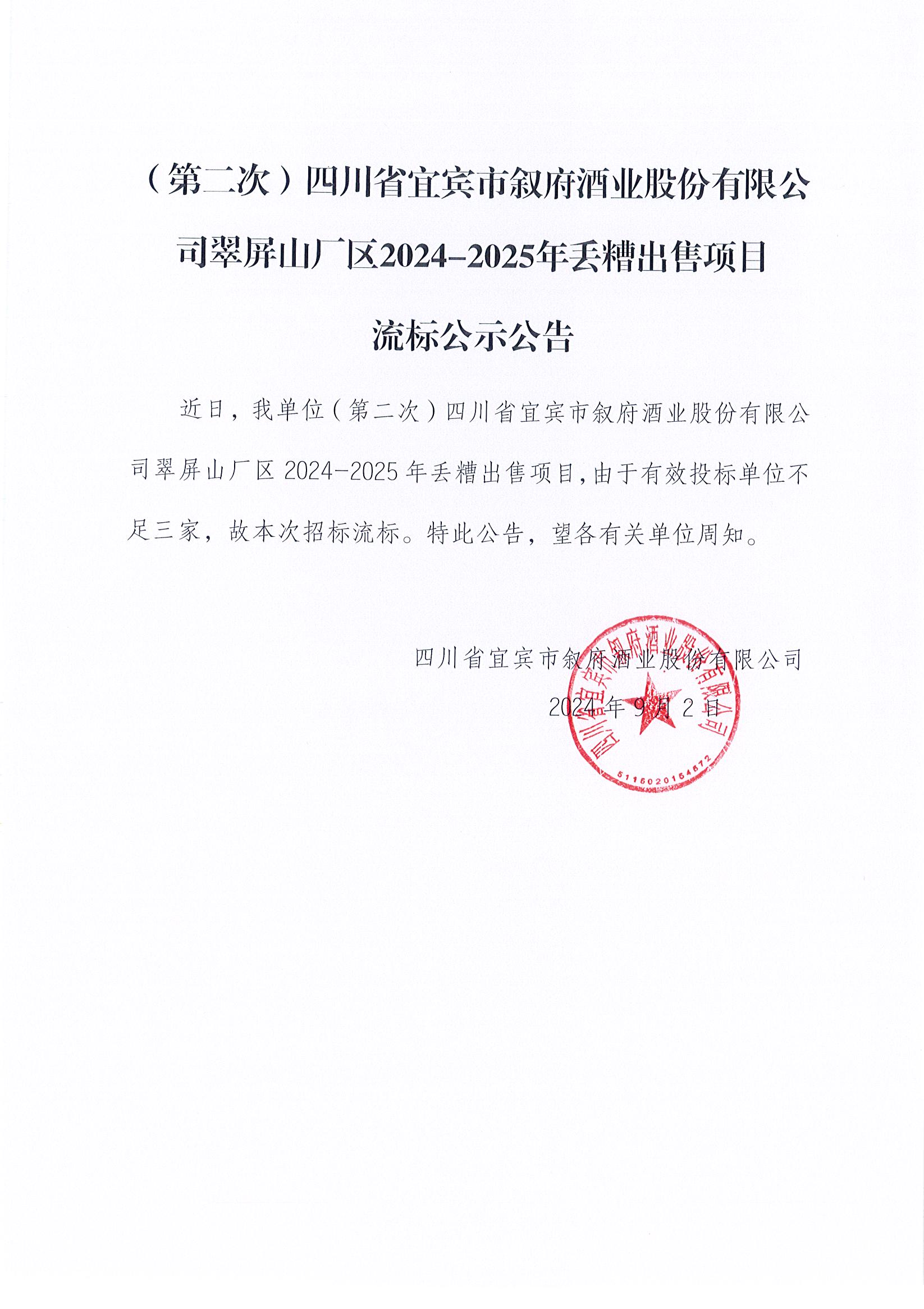 (第二次)四川省宜賓市敘府酒業(yè)股份有限公司翠屏山廠區(qū)2024-2025年丟糟出售項(xiàng)目 流標(biāo)公示公告