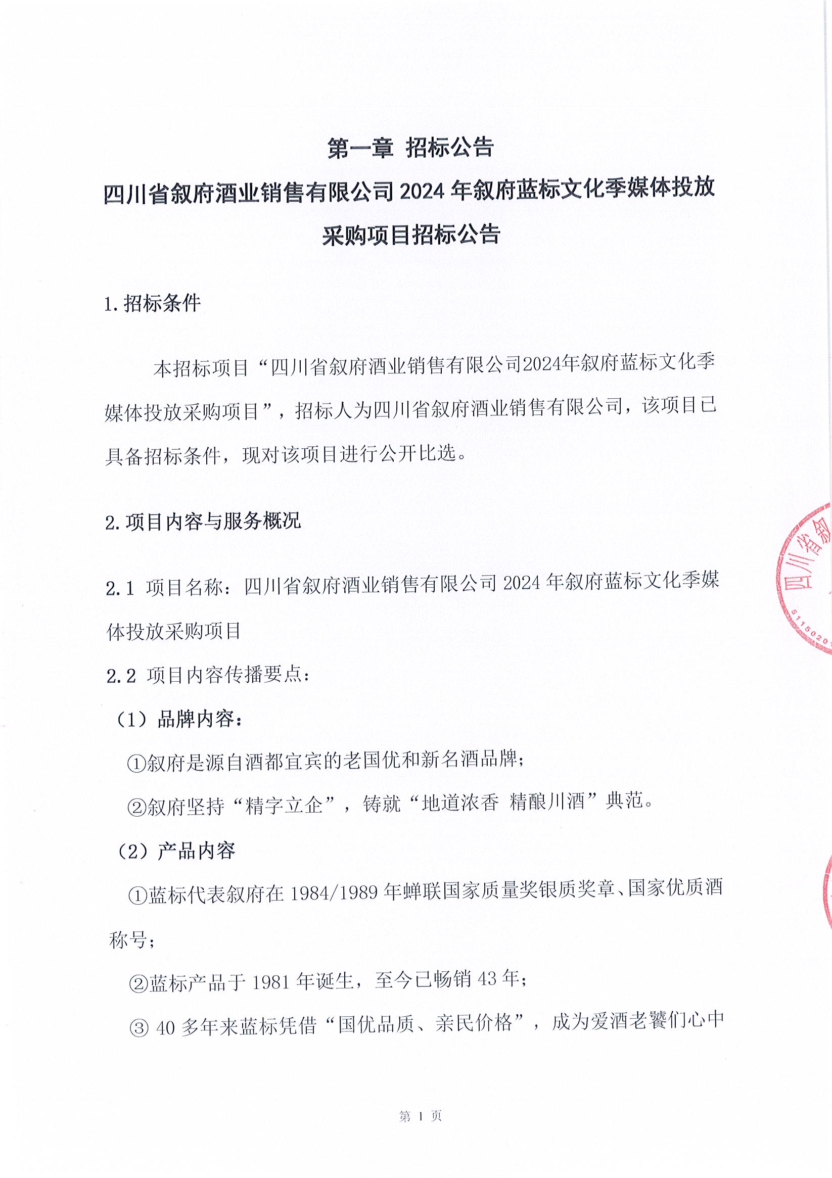四川省敘府酒業(yè)銷售有限公司2024年敘府藍(lán)標(biāo)文化季媒體投放采購(gòu)項(xiàng)目比選公示公告