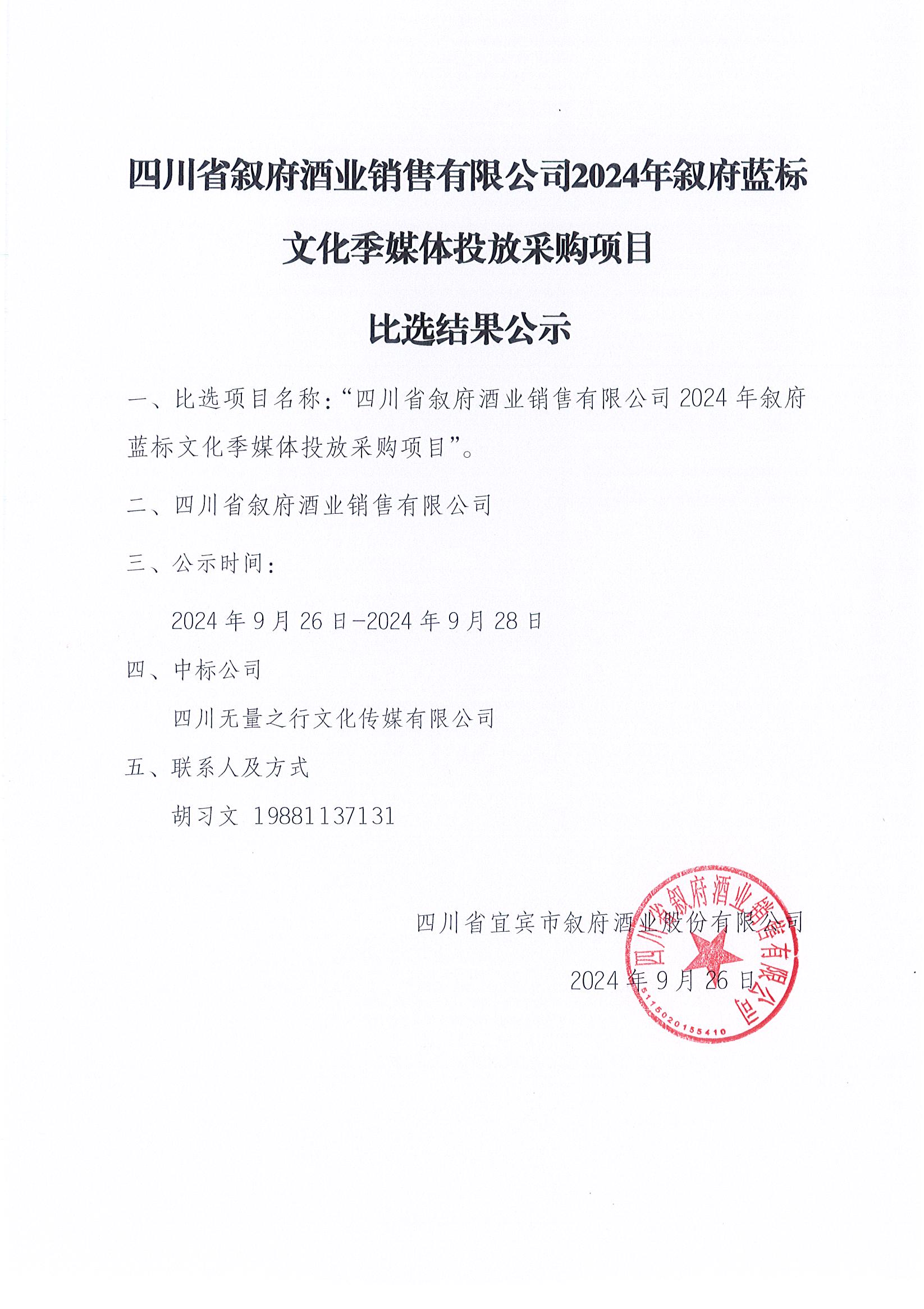 四川省敘府酒業(yè)銷售有限公司2024年敘府藍(lán)標(biāo)文化季媒體投放采購(gòu)項(xiàng)目比選結(jié)果公示公告