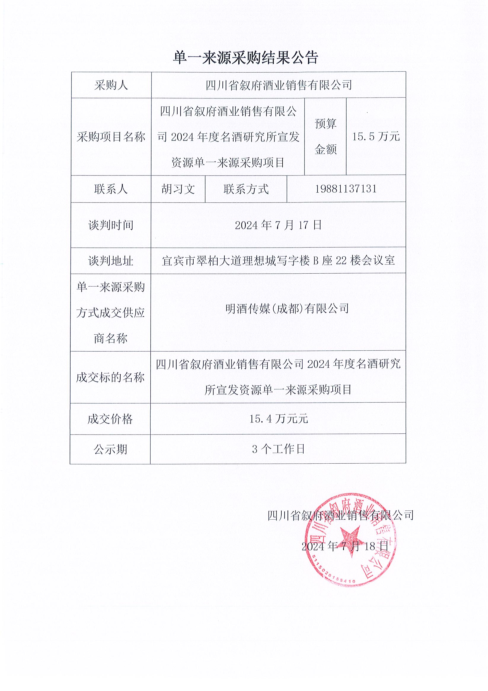 四川省敘府酒業(yè)銷售有限公司2024年度名酒研究所宣發(fā)資源單一來源采購項(xiàng)目中標(biāo)結(jié)果公示公告