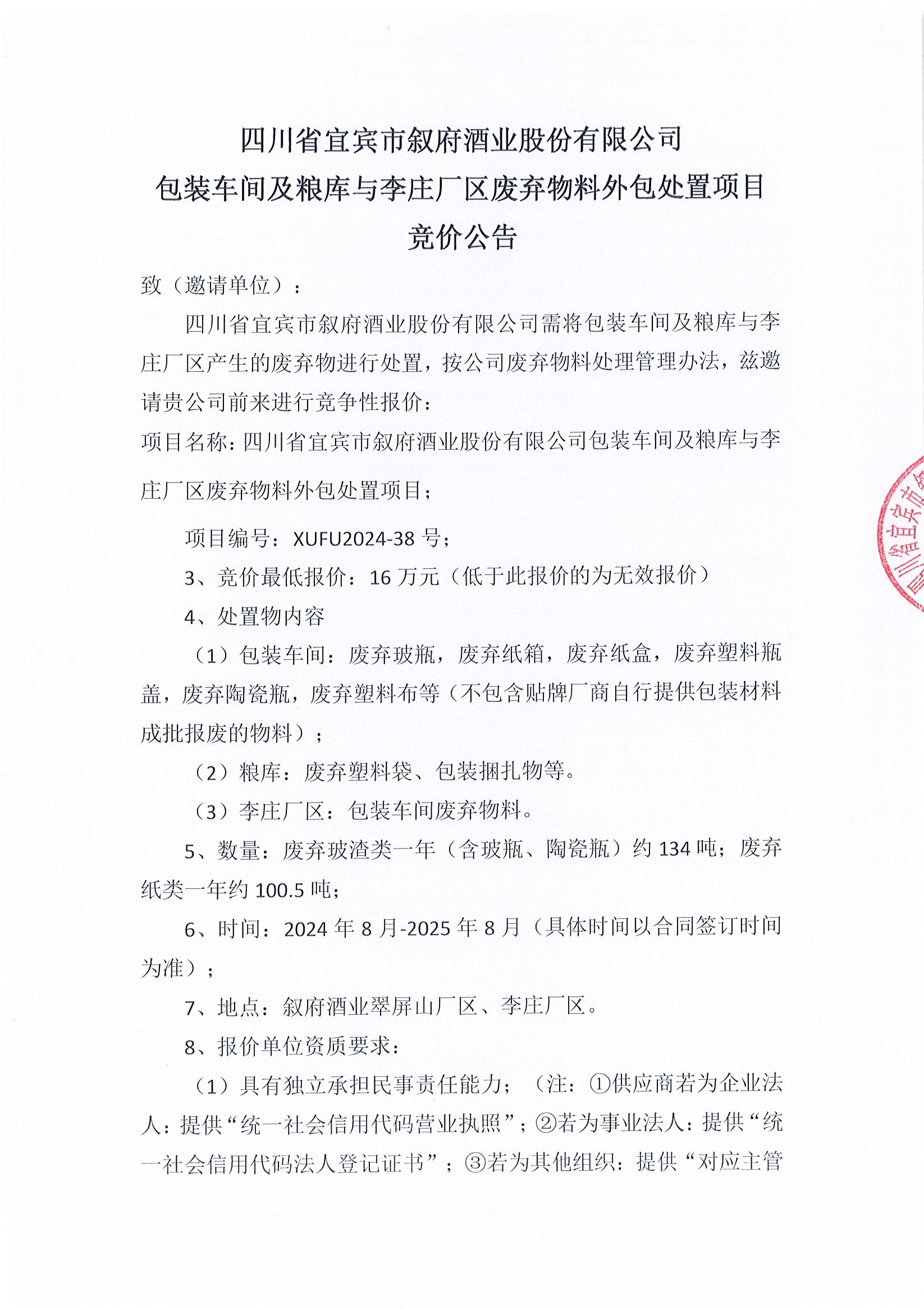 四川省宜賓市敘府酒業(yè)股份有限公司包裝車間及糧庫與李莊廠區(qū)廢棄物料外包處置項(xiàng)目競價(jià)公告