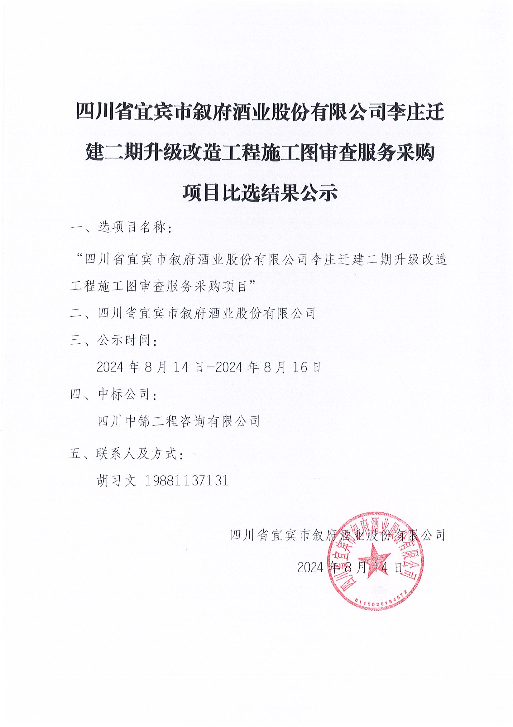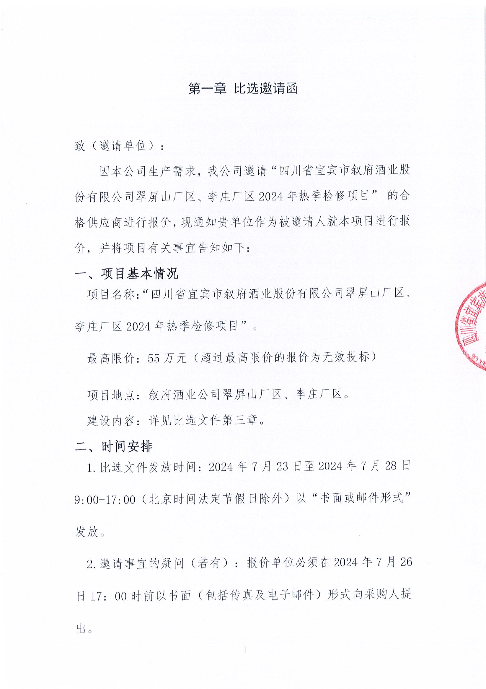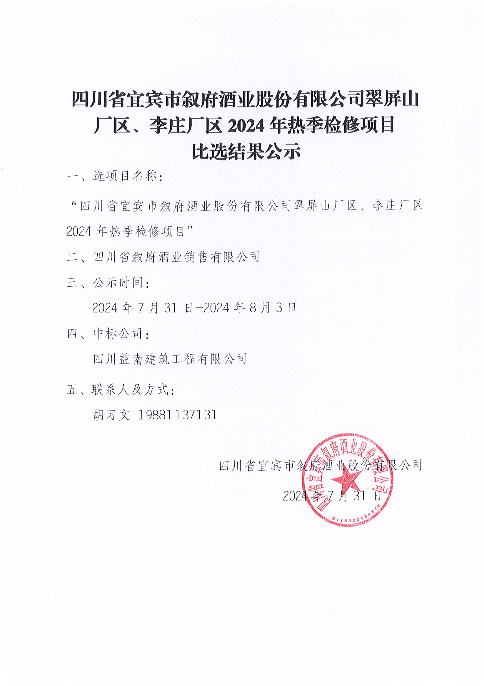 四川省宜賓市敘府酒業(yè)股份有限公司翠屏山廠區(qū)、李莊廠區(qū)2024年熱季檢修項(xiàng)目公開比選公示公告
