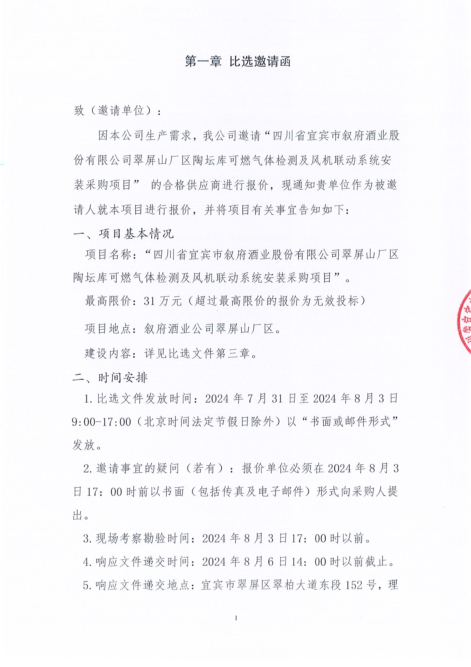 四川省宜賓市敘府酒業(yè)股份有限公司翠屏山廠區(qū)陶壇庫可燃?xì)怏w檢測及風(fēng)機(jī)聯(lián)動(dòng)系統(tǒng)安裝采購項(xiàng)目公開比選公示公告