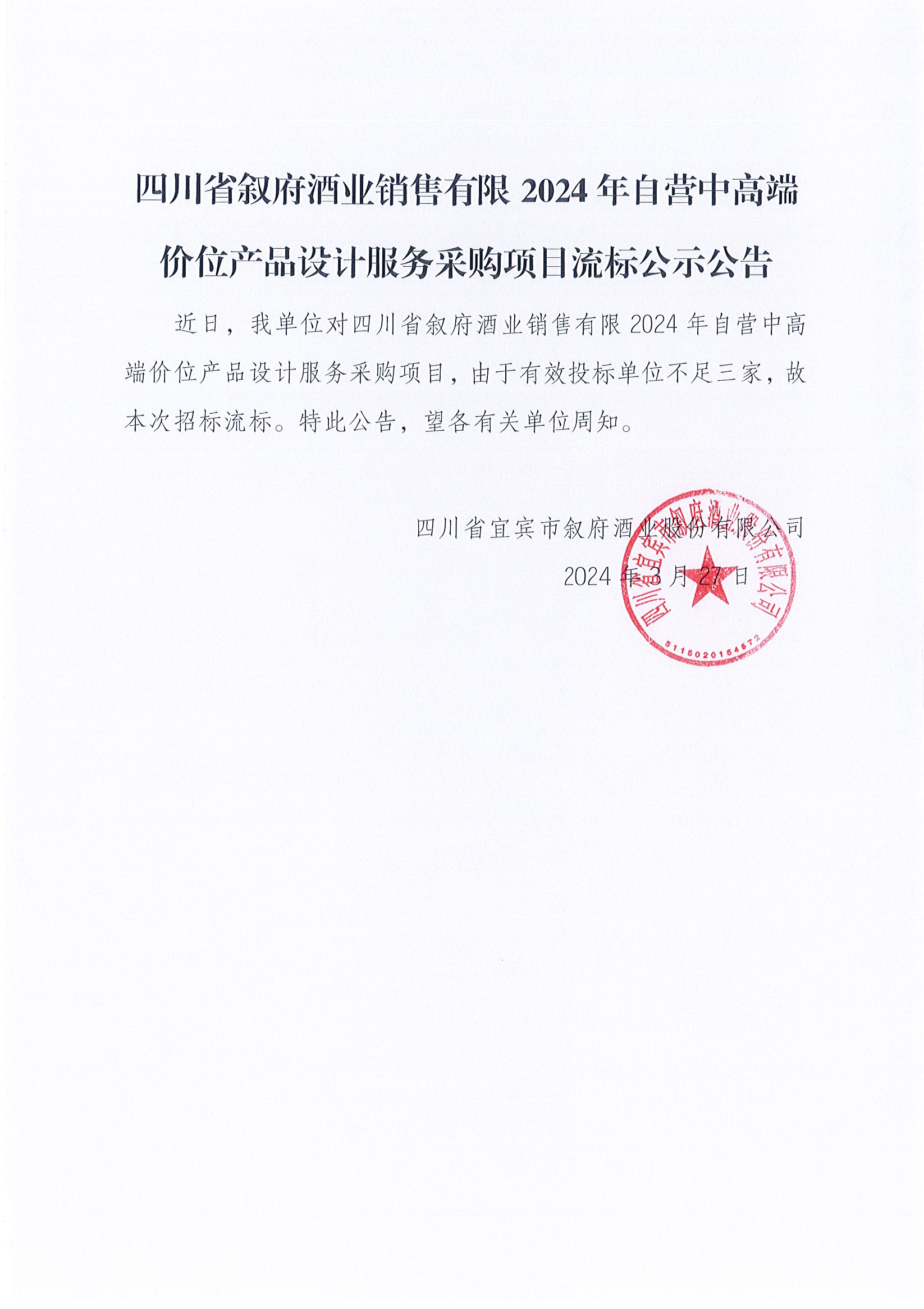 四川省敘府酒業(yè)銷售有限公司 2024年自營中高端價位產(chǎn)品設(shè)計(jì) 服務(wù)采購項(xiàng)目流標(biāo)公示公告