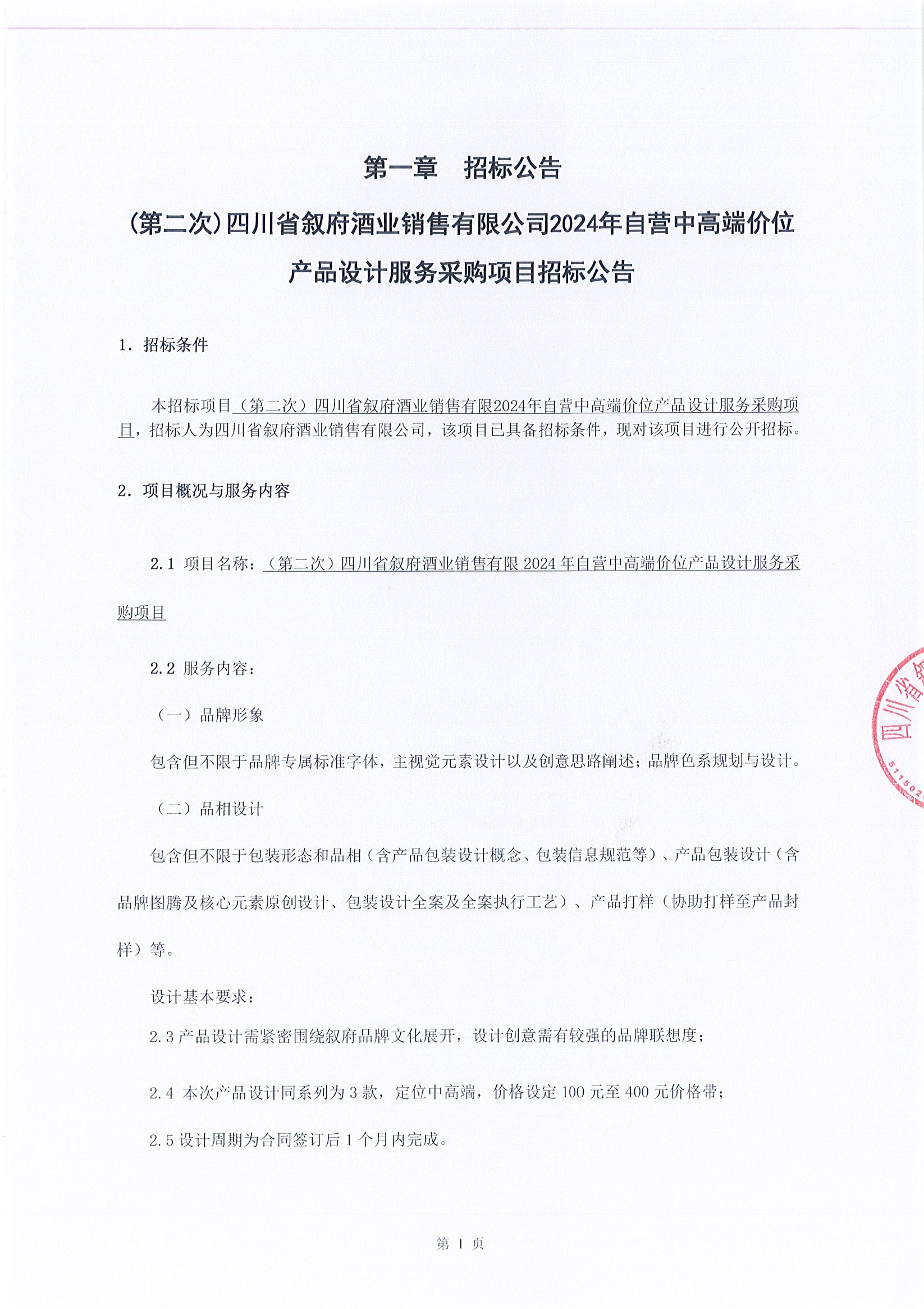 第二次)四川省敘府酒業(yè)銷售有限公司2024年自營中高端價位產(chǎn)品設(shè)計(jì)服務(wù)采購項(xiàng)目招標(biāo)公示公告