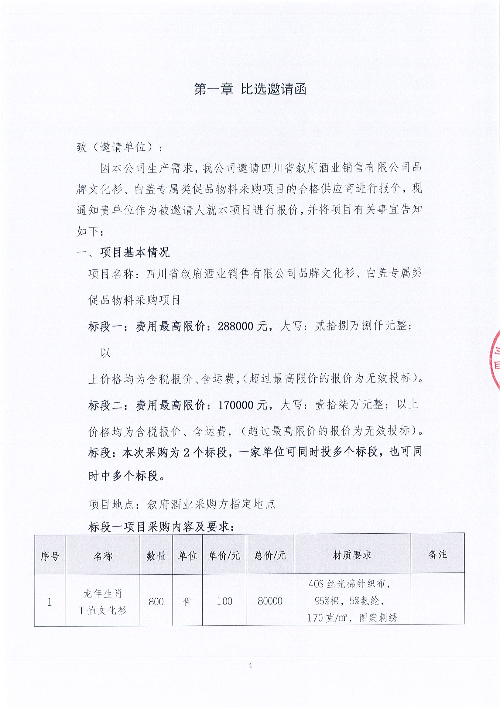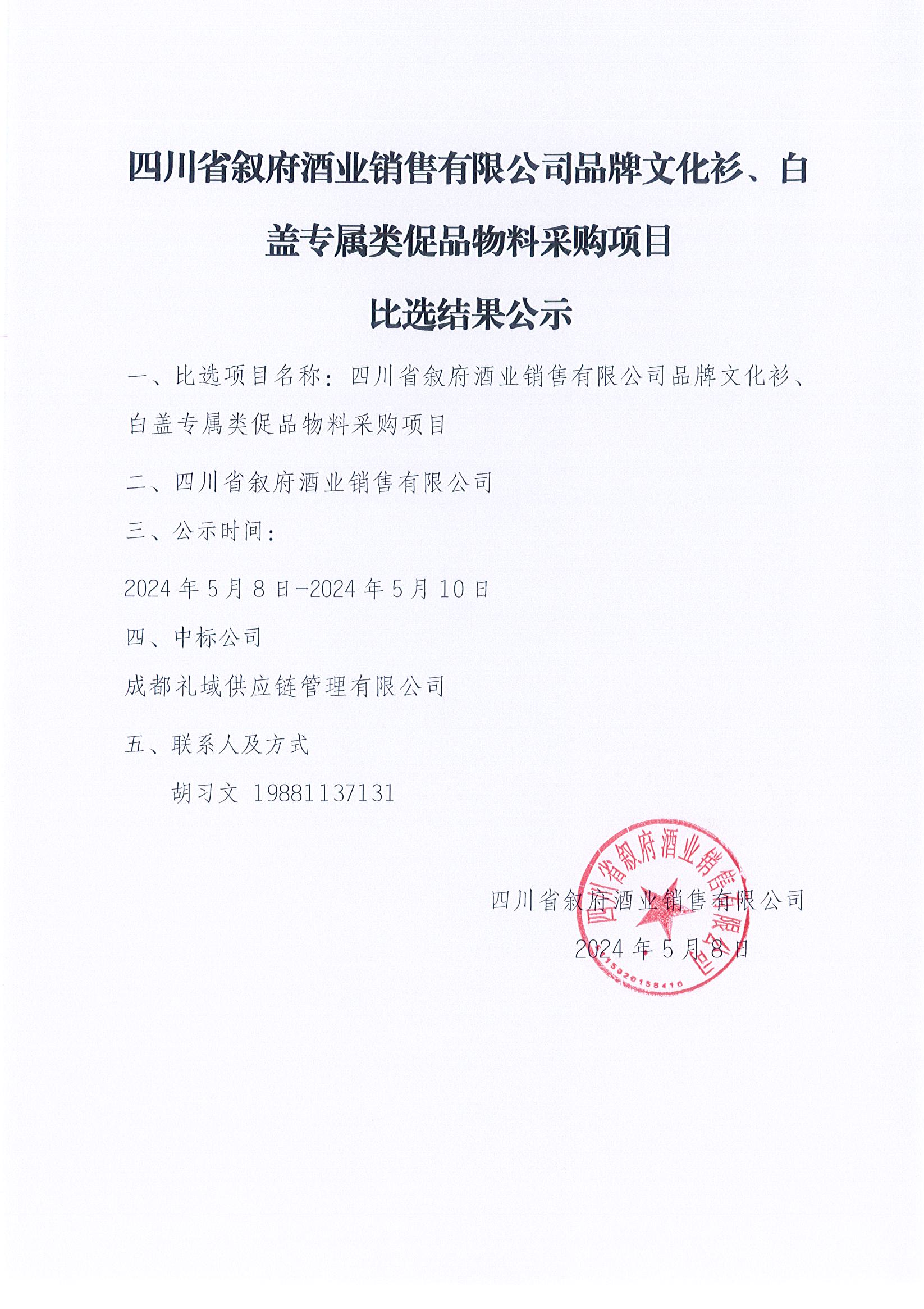 四川省敘府酒業(yè)銷售有限公司品牌文化衫、白蓋專屬類促品物料采購項(xiàng)目公開比選項(xiàng)目公示公告