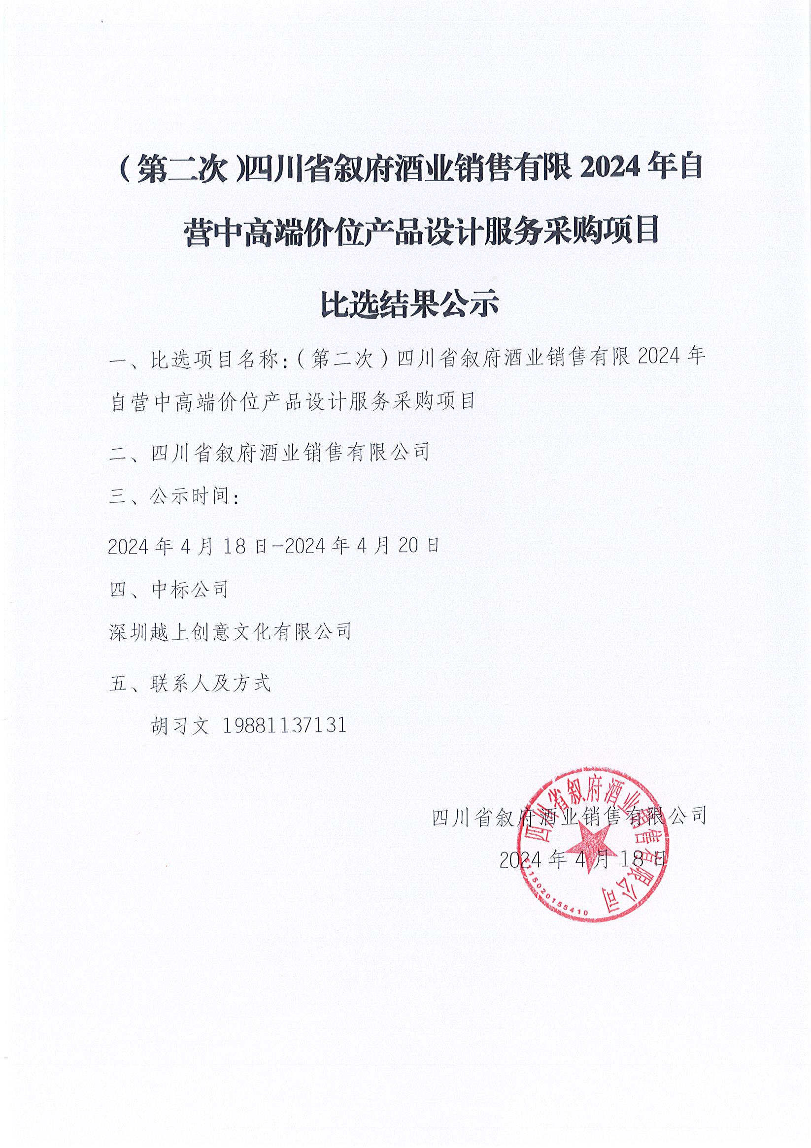(第二次)四川省敘府酒業(yè)銷售有限公司2024年自營中高端價位產(chǎn)品設(shè)計(jì)服務(wù)采購項(xiàng)目中標(biāo)結(jié)果公示公告
