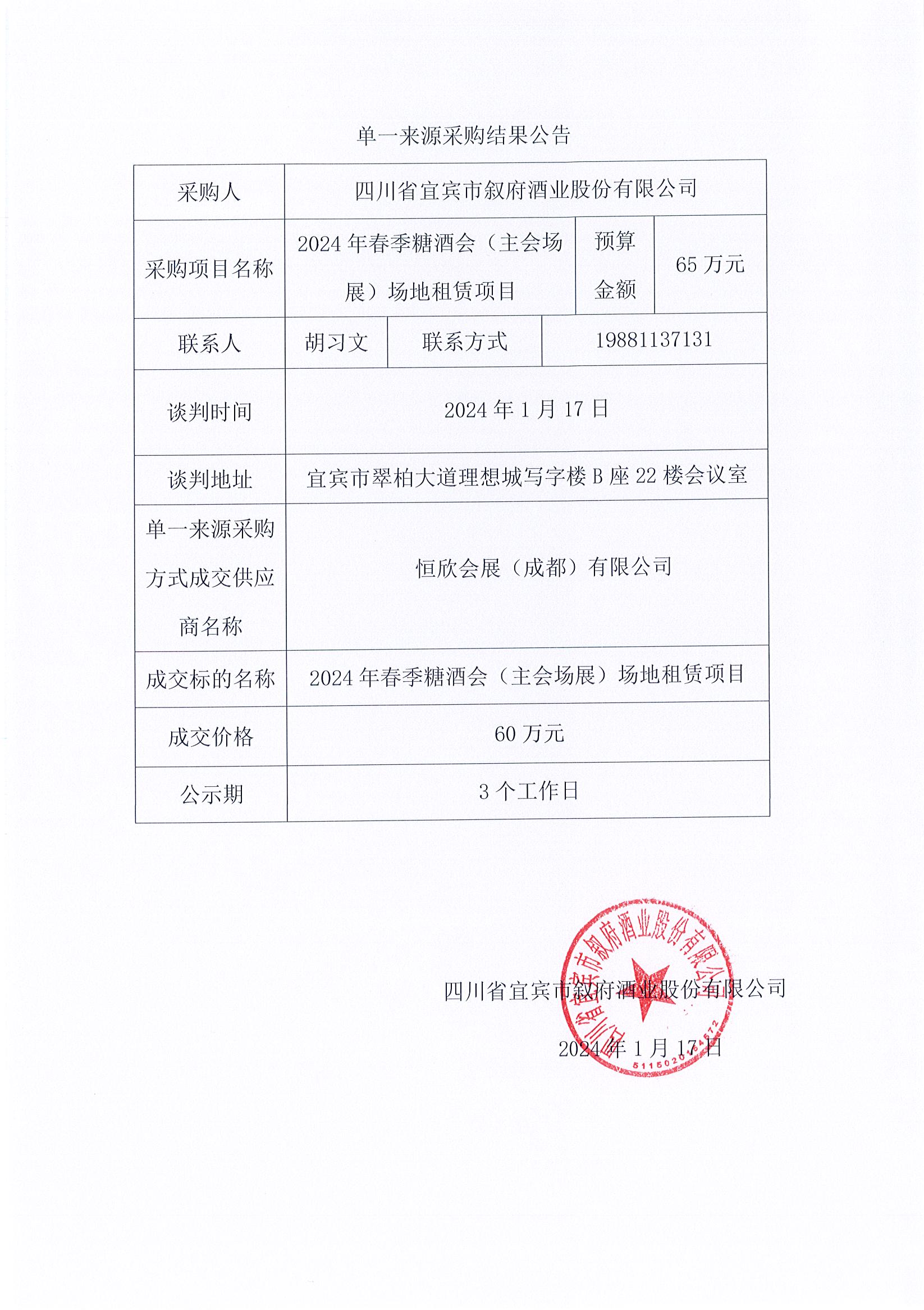 四川省宜賓市敘府酒業(yè)股份有限公司 2024年春季糖酒會(huì)(會(huì)展中心場地展)場地租賃中標(biāo)結(jié)果公示公告