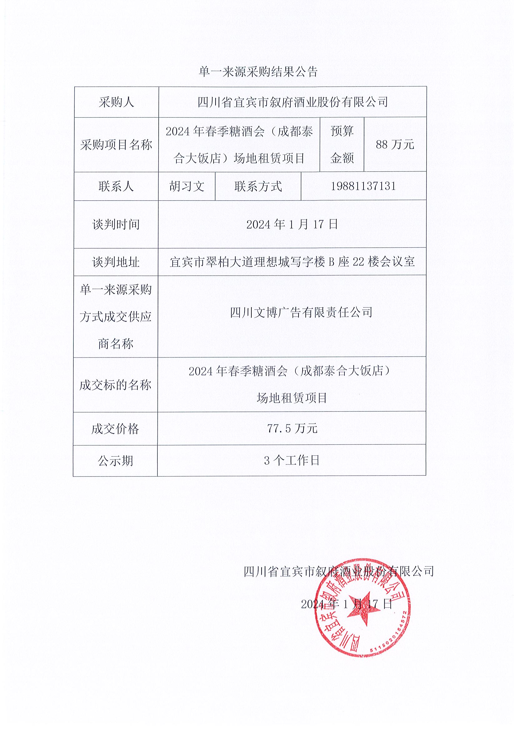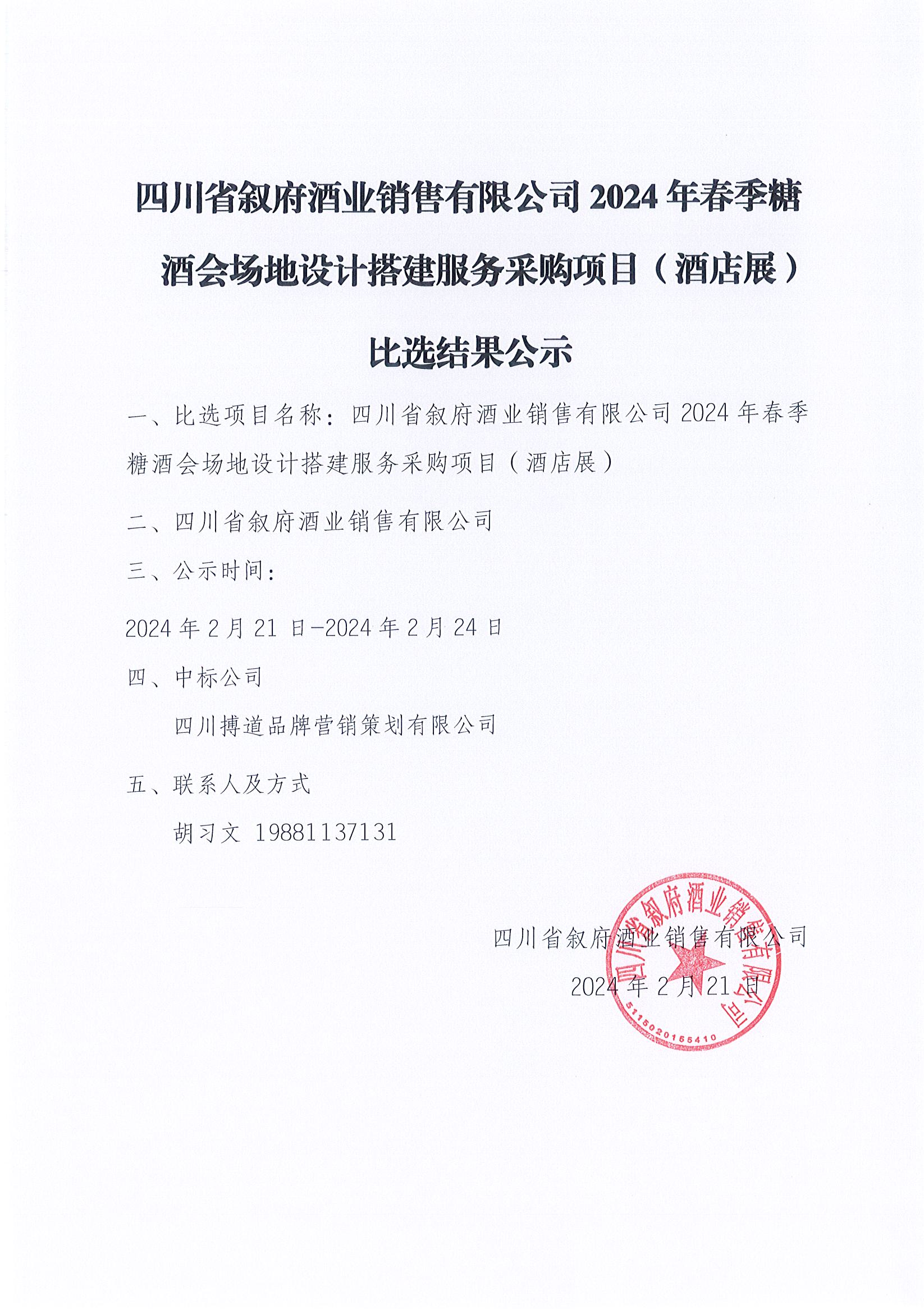 四川省宜賓市敘府酒業(yè)股份有限公司 2024年春季糖酒會(huì)(成都泰合國際大飯店)場地租賃中標(biāo)結(jié)果公示公告