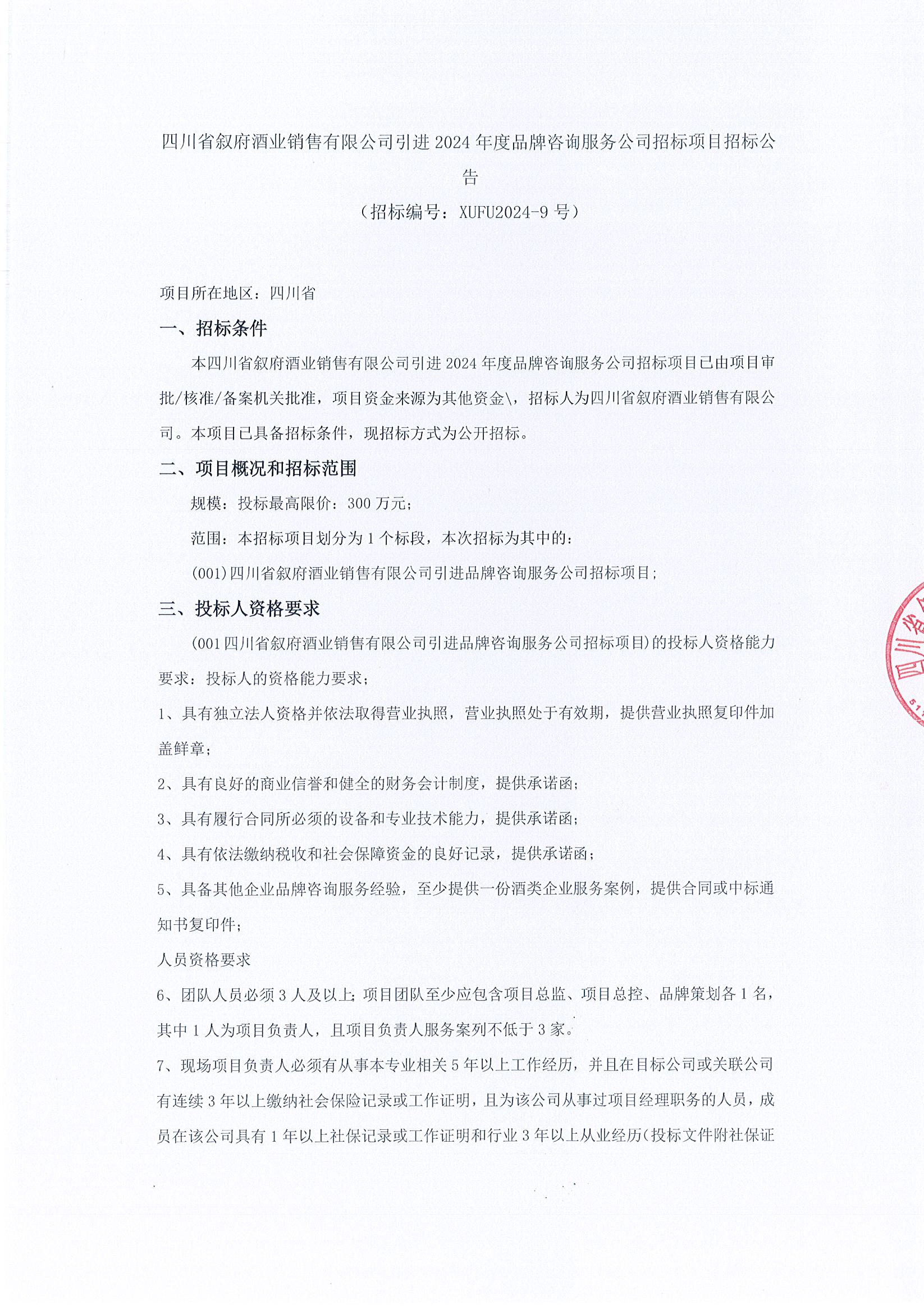 四川省敘府酒業(yè)銷售有限公司 引進(jìn)2024年度品牌咨詢服務(wù)公司招標(biāo)項(xiàng)目公告