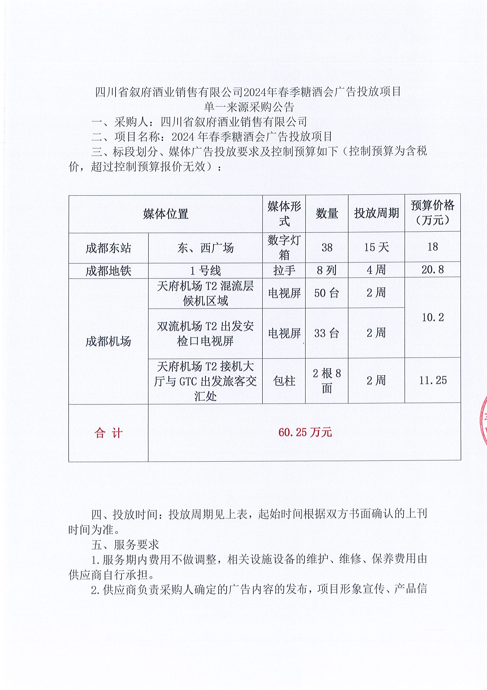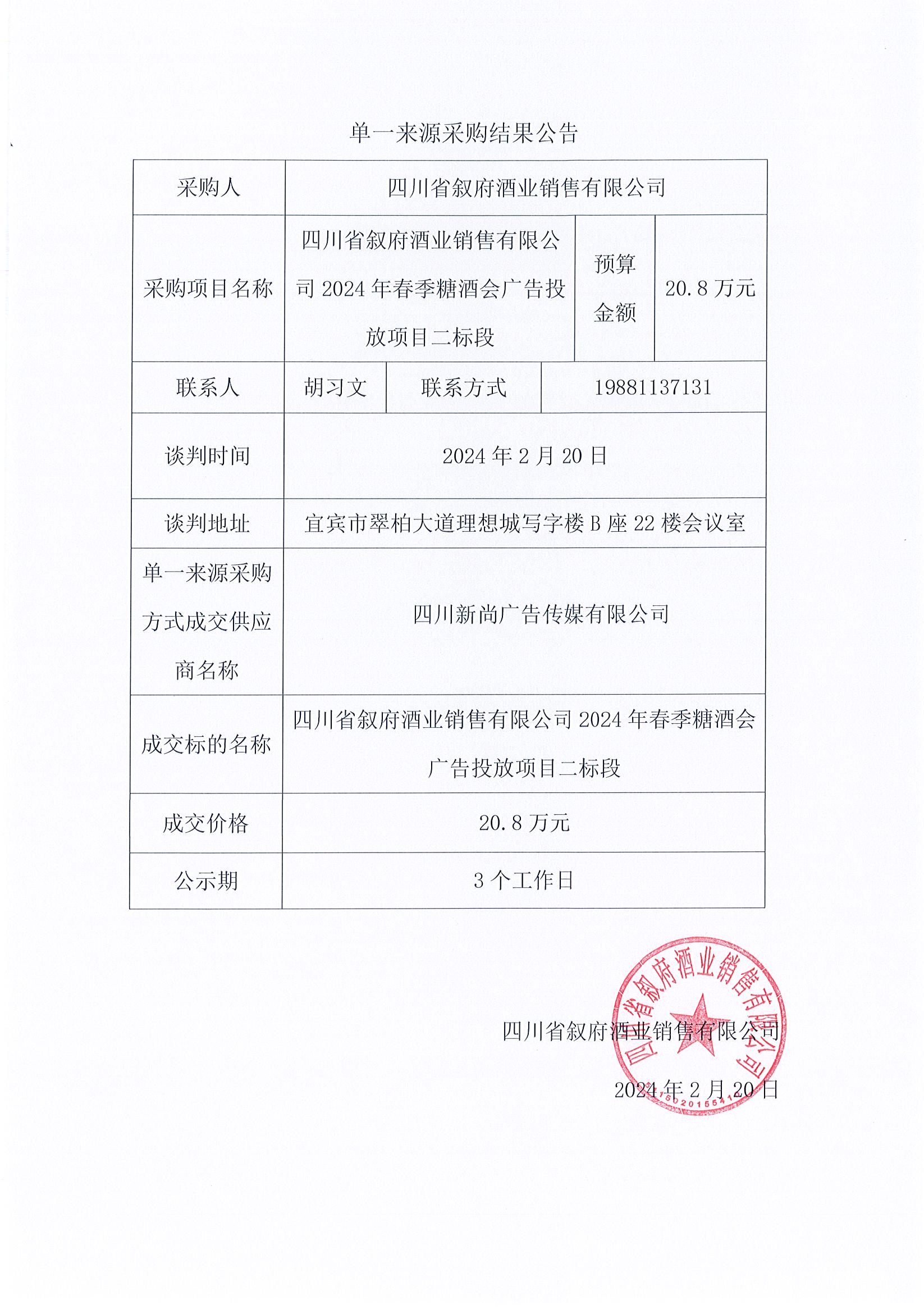 四川省敘府酒業(yè)銷售有限公司2024年春季糖酒會(huì)廣告投放項(xiàng)目 單一來源采購結(jié)果公示公告