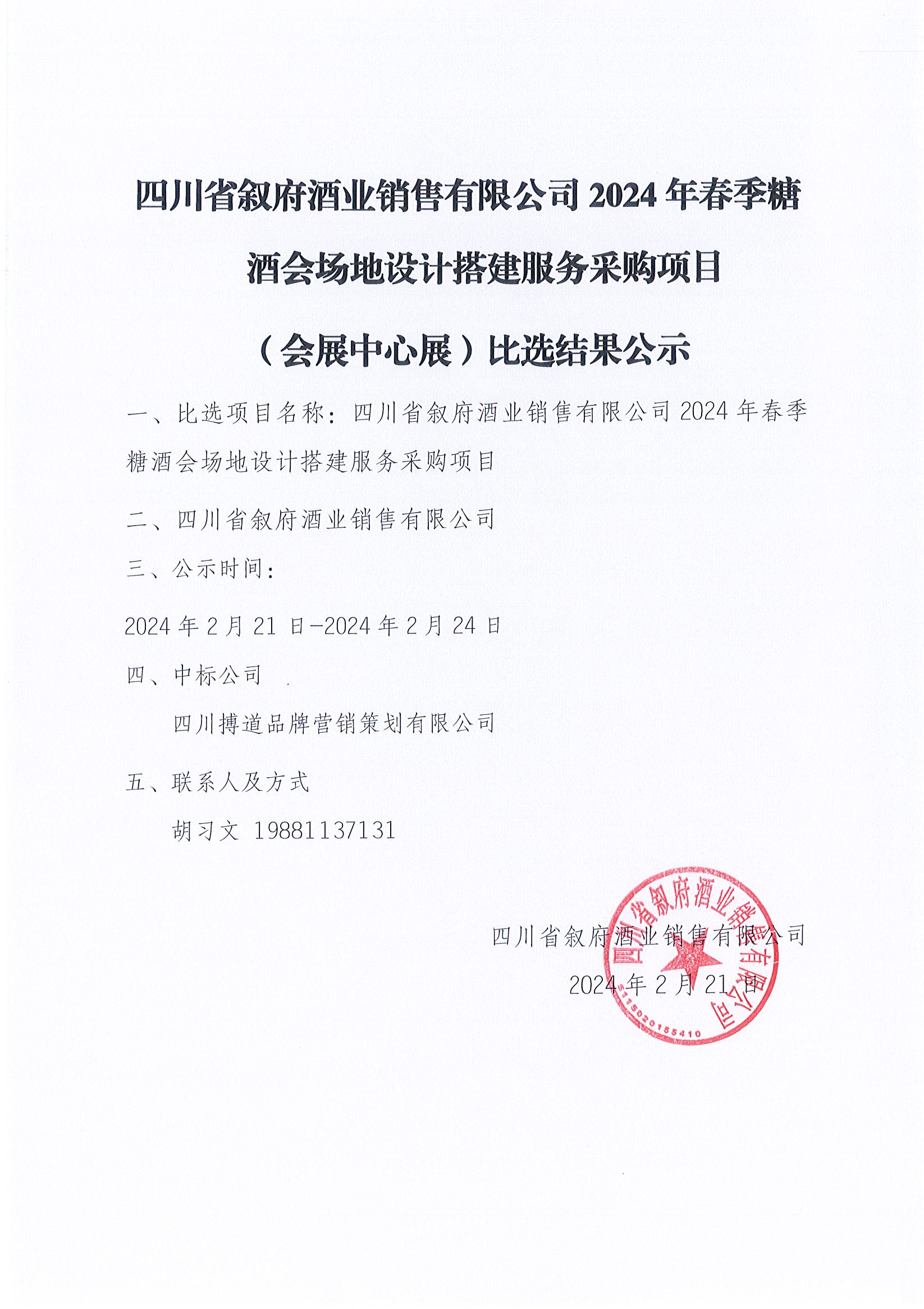 四川省敘府酒業(yè)銷售有限公司2024年春季糖酒會(huì)場地設(shè)計(jì)搭建服務(wù)采購項(xiàng)目(會(huì)展中心)搭建中標(biāo)結(jié)果公示公告四川省敘府酒業(yè)銷售有限公司2024年春季糖酒會(huì)場地設(shè)計(jì)搭建服務(wù)采購項(xiàng)目中標(biāo)結(jié)果公示公告