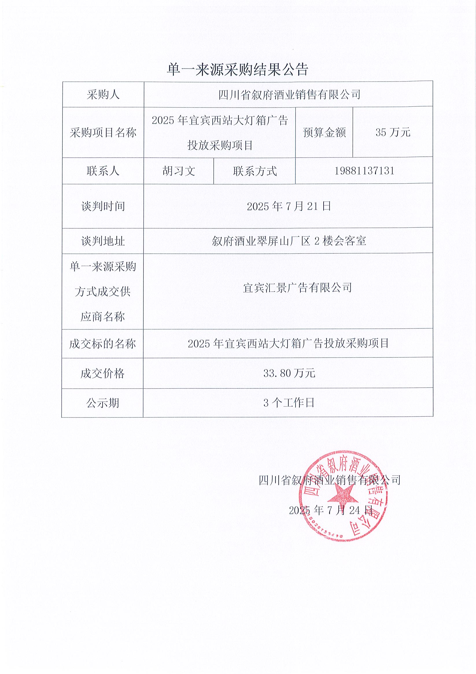 四川省敘府酒業(yè)銷售有限公司2025年宜賓西站大燈箱廣告投放采購(gòu)項(xiàng)目單一來源采購(gòu)結(jié)果公示公告