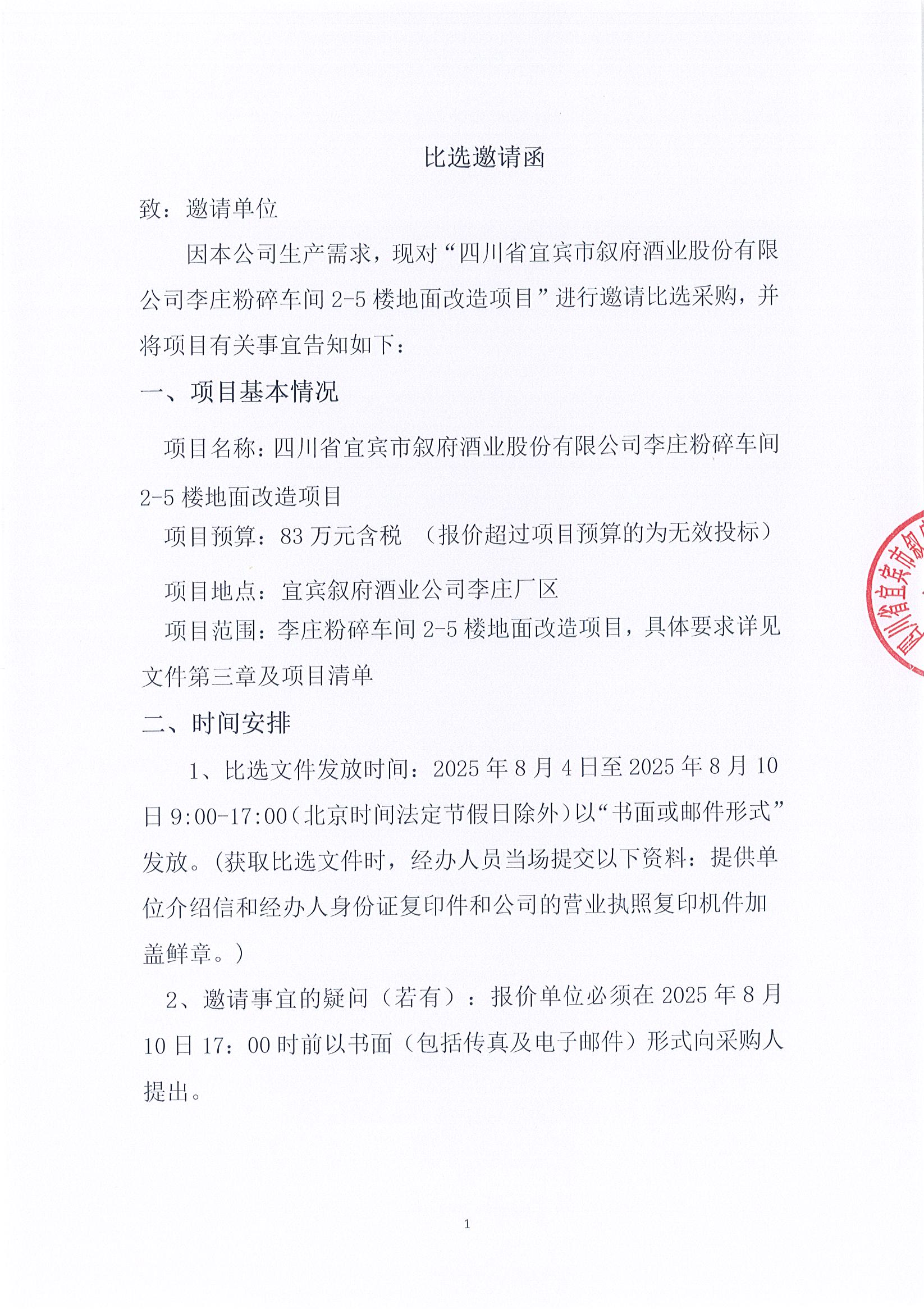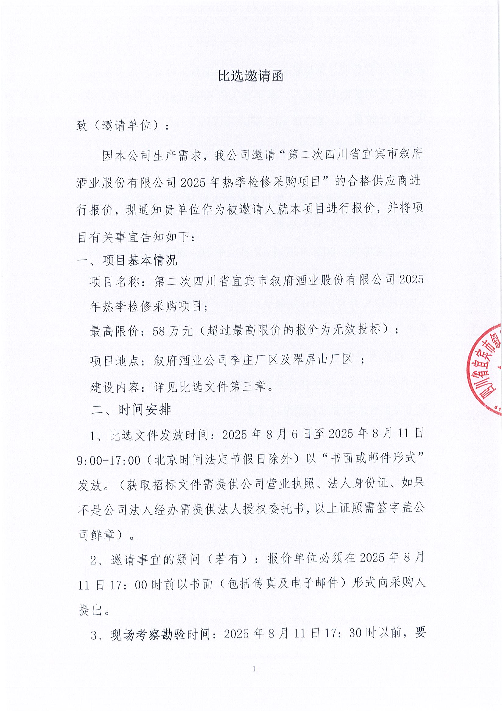 第二次四川省宜賓市敘府酒業(yè)股份有限公司2025年熱季檢修采購(gòu)項(xiàng)目比選公告