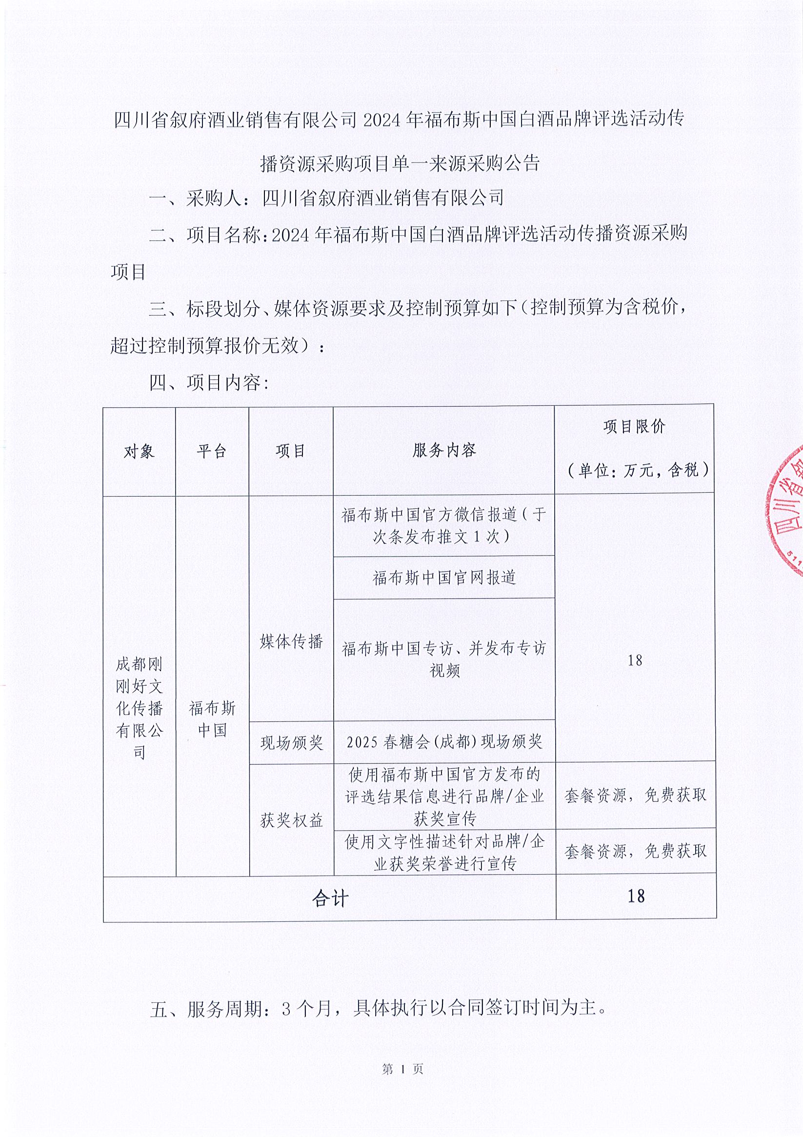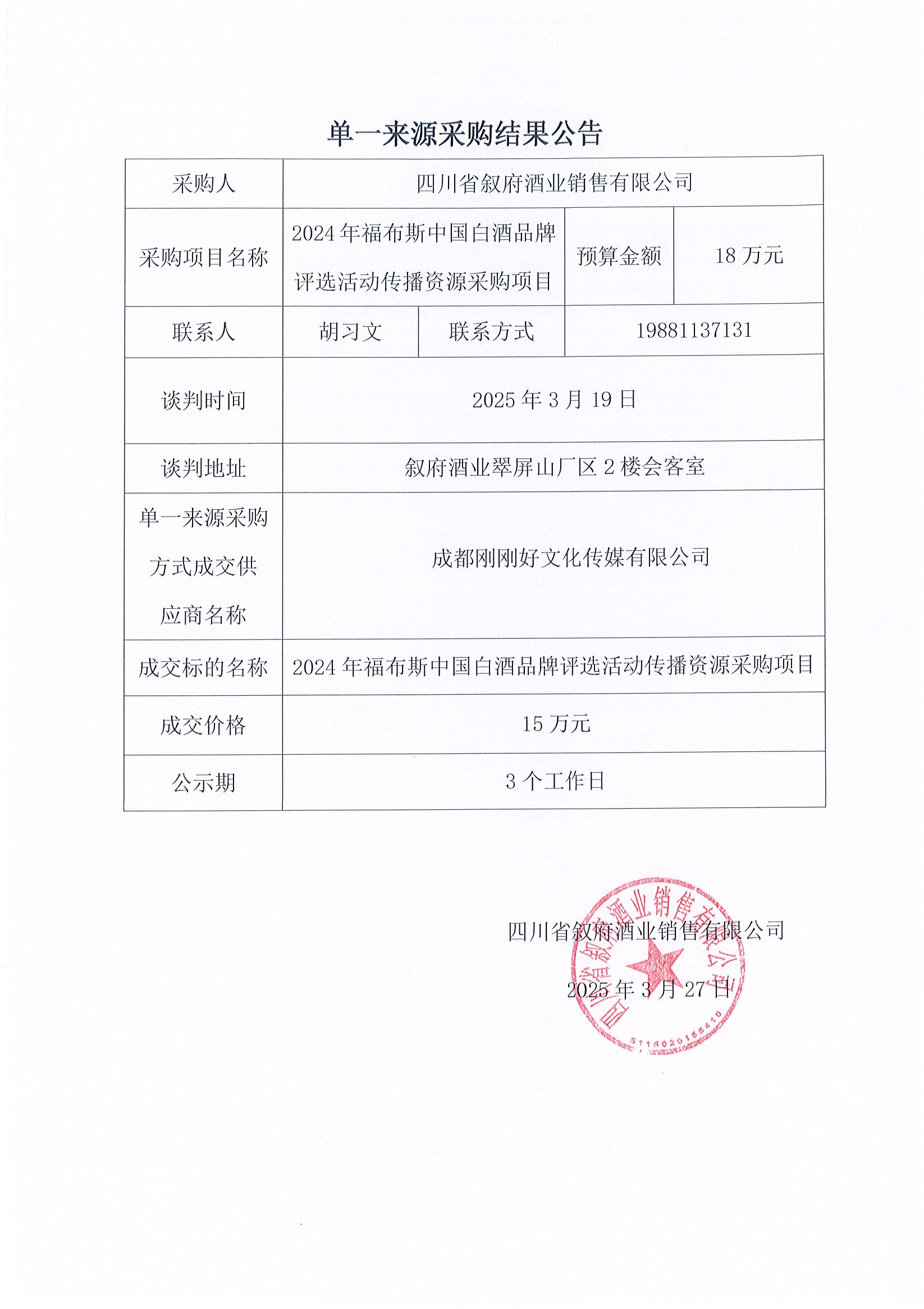四川省敘府酒業(yè)銷售有限公司2024年福布斯中國白酒品牌評選活動傳播資源采購項目單一來源采購公告