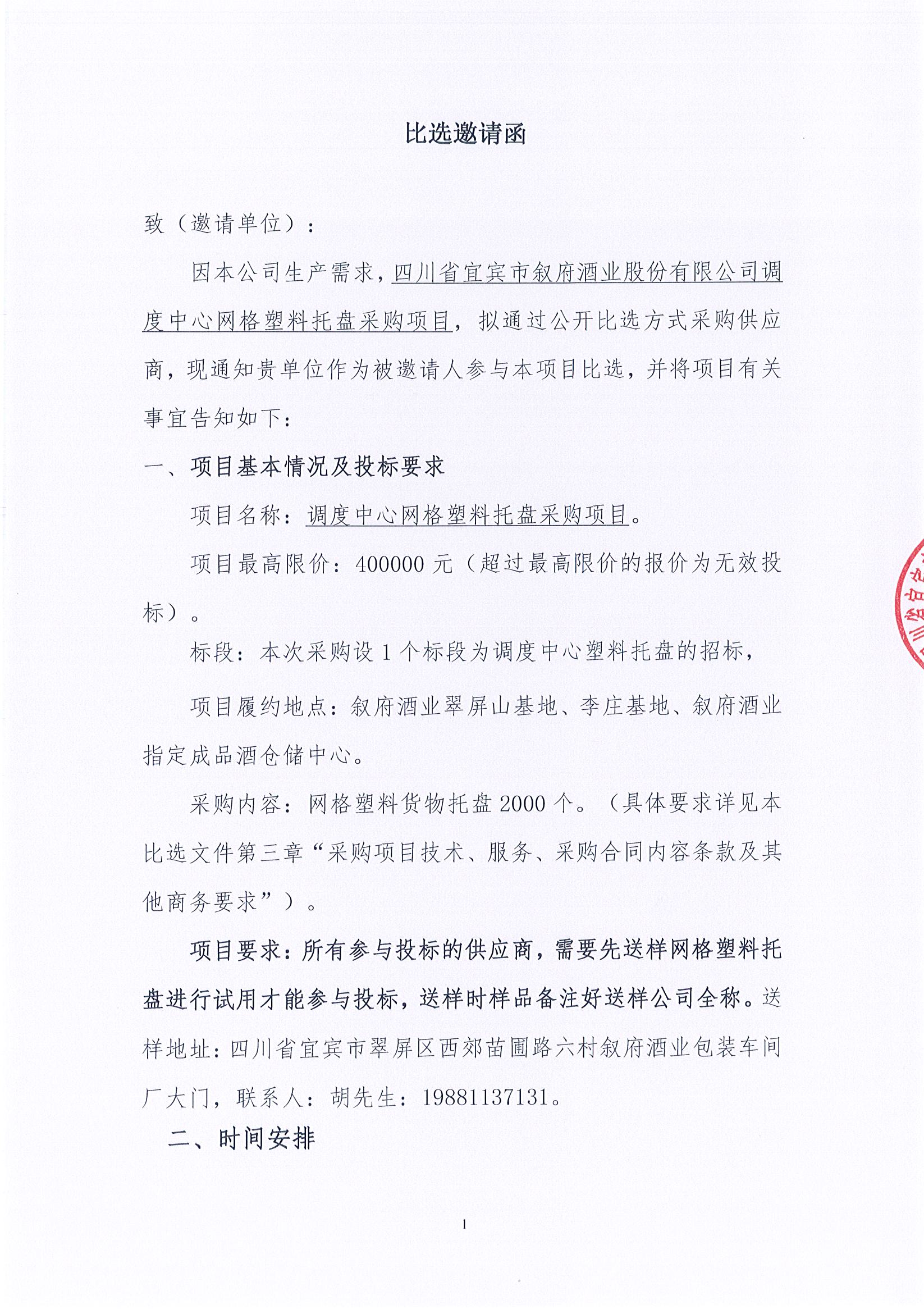 四川省宜賓市敘府酒業(yè)股份有限公司調度中心網格塑料托盤采購項目招標公告