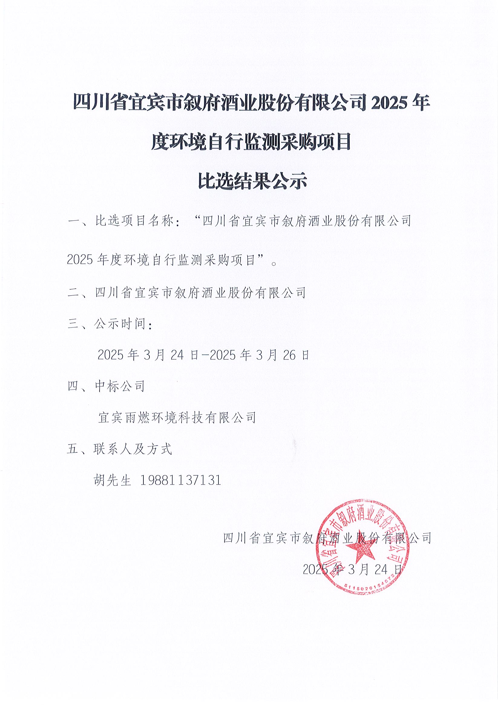 四川省宜賓市敘府酒業(yè)股份有限公司2025年度環(huán)境自行監(jiān)測采購項目比選結果公示