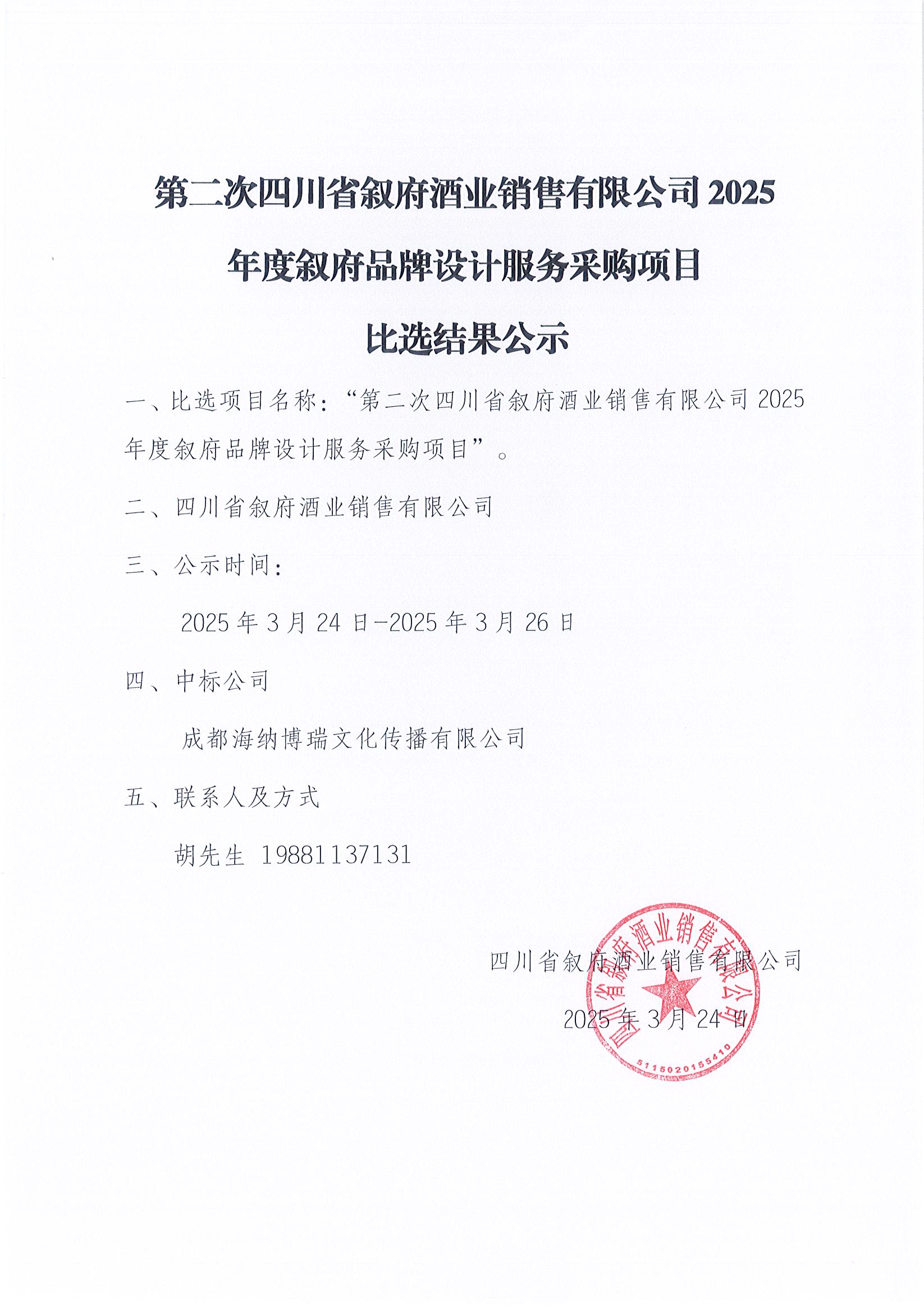 第二次四川省敘府酒業(yè)銷售有限公司2025年度敘府品牌設計服務采購項目比選結果公示