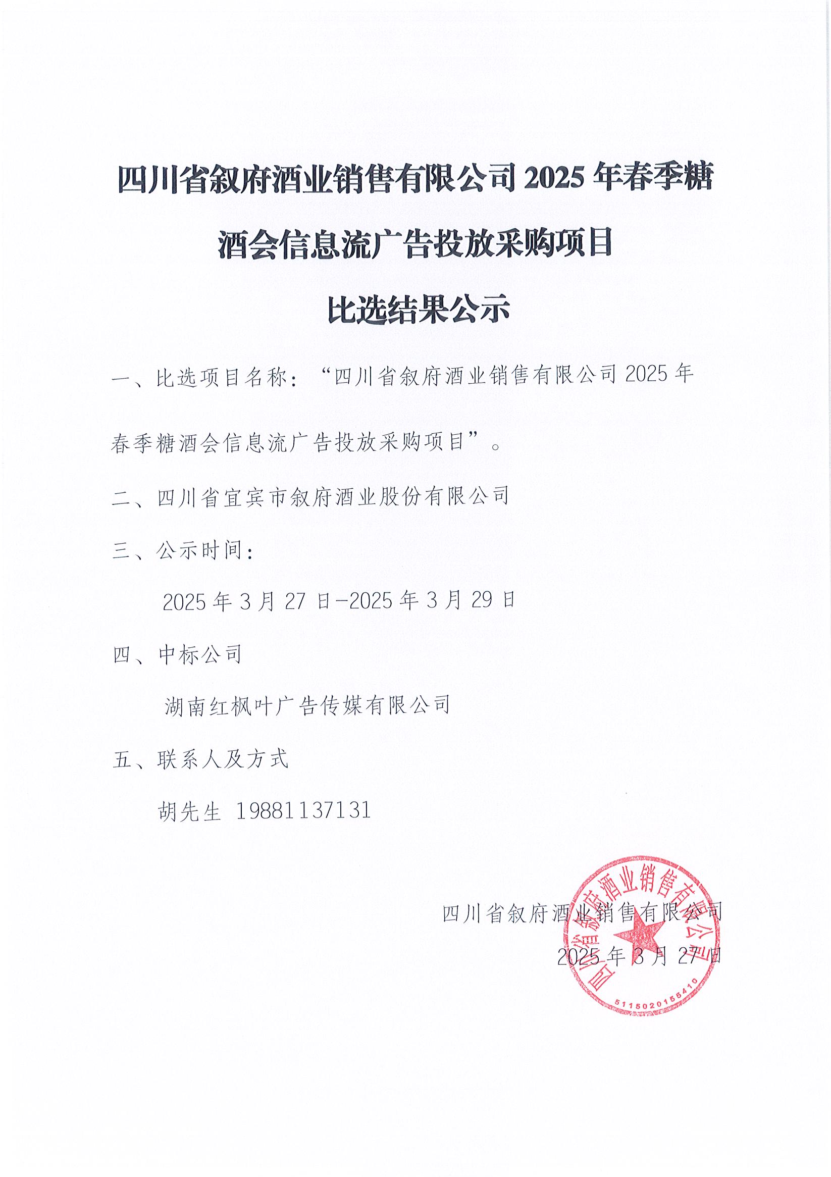 四川省敘府酒業(yè)銷售有限公司2025年春季糖酒會信息流廣告投放采購項目比選結果公示