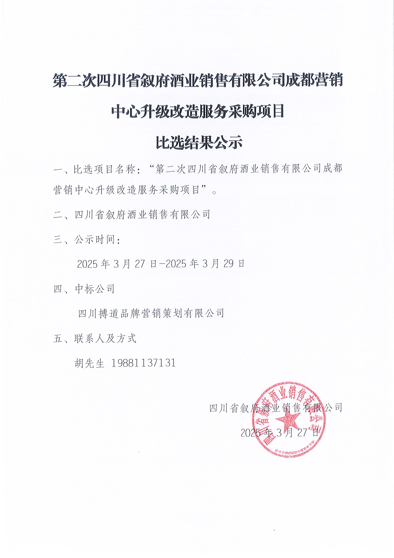 第二次四川省敘府酒業(yè)銷售有限公司成都營銷中心升級改造服務采購項目比選結果公示
