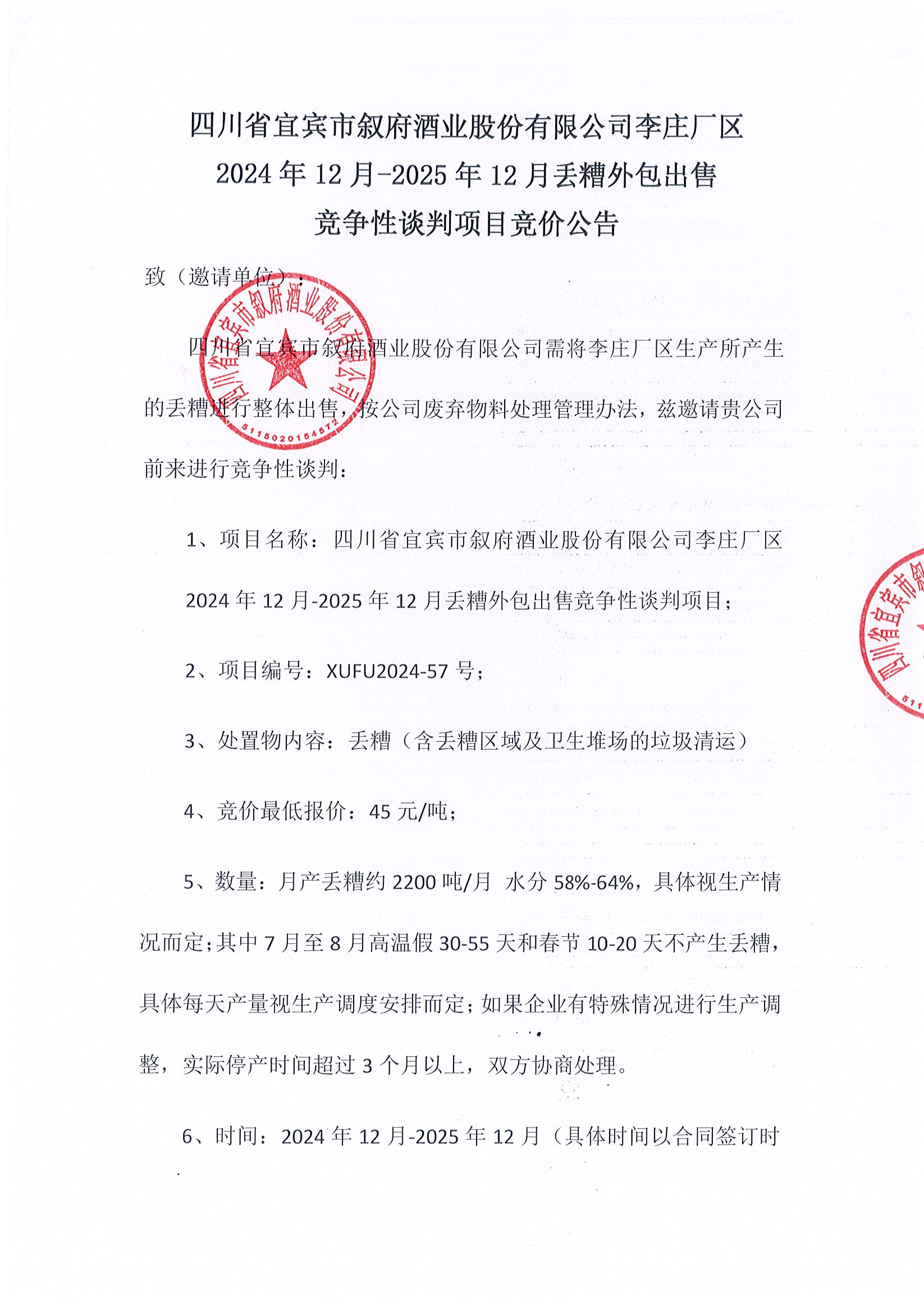 四川省宜賓市敘府酒業(yè)股份有限公司李莊廠區(qū) 2024年12月-2025年12月丟糟外包出售 競(jìng)爭(zhēng)性談判項(xiàng)目競(jìng)價(jià)公告