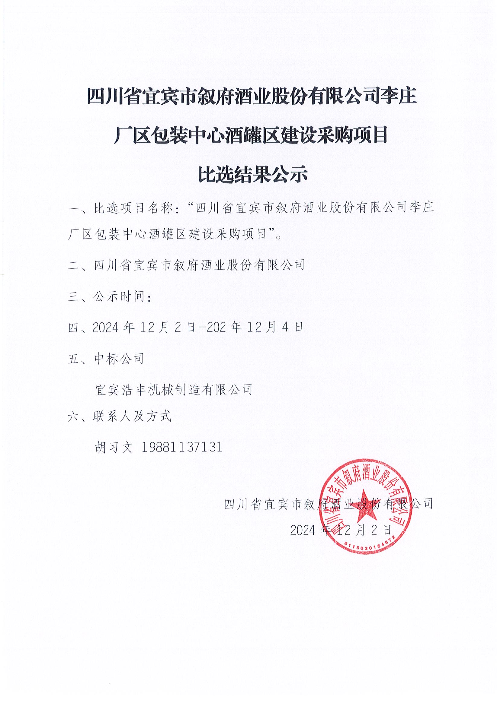 四川省宜賓市敘府酒業(yè)股份有限公司李莊廠區(qū)包裝中心酒罐區(qū)建設(shè)采購(gòu)項(xiàng)目比選結(jié)果公示