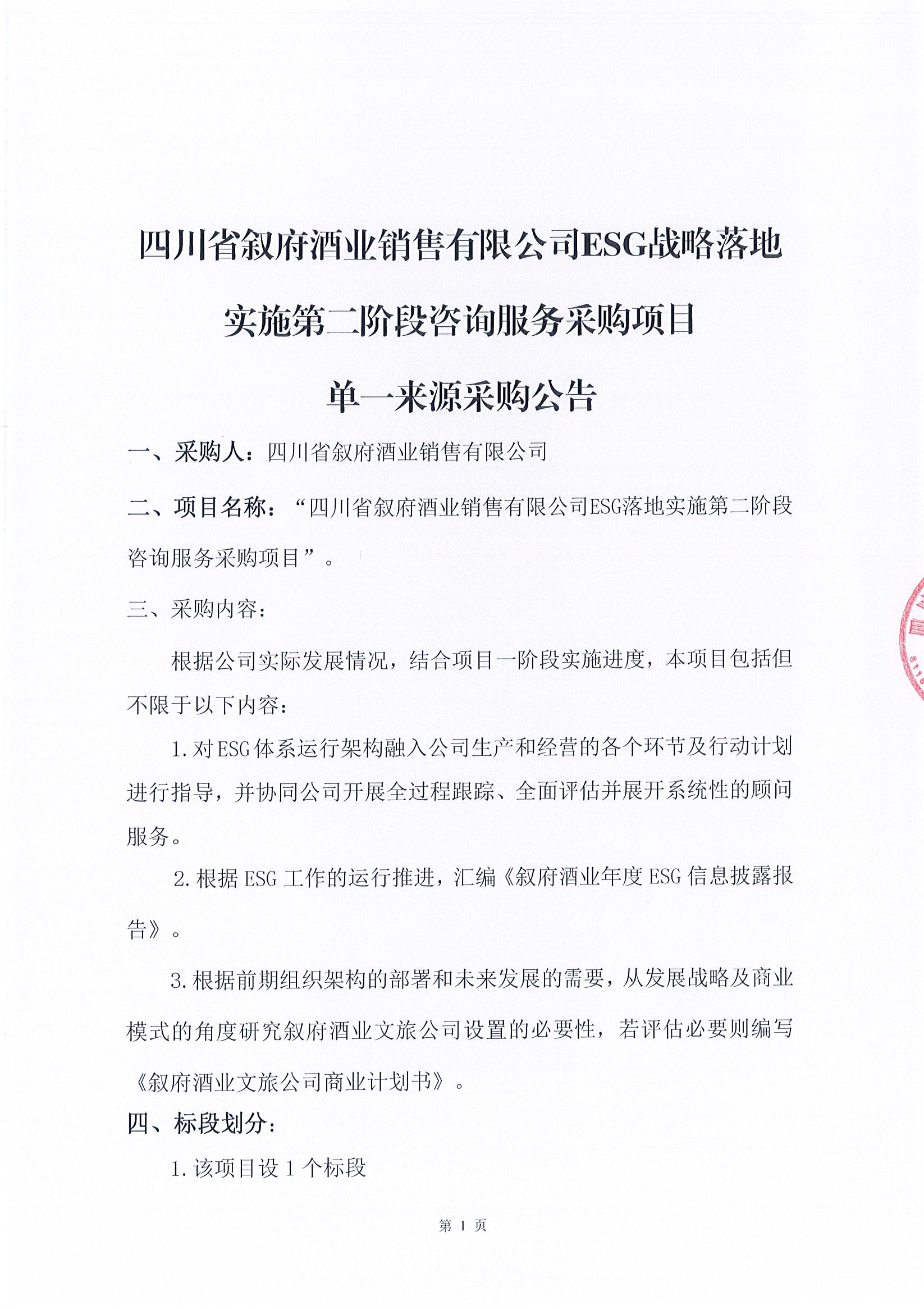 四川省敘府酒業(yè)銷售有限公司ESG落地實(shí)施第二階段咨詢服務(wù)采購(gòu)項(xiàng)目單一來(lái)源公示公告