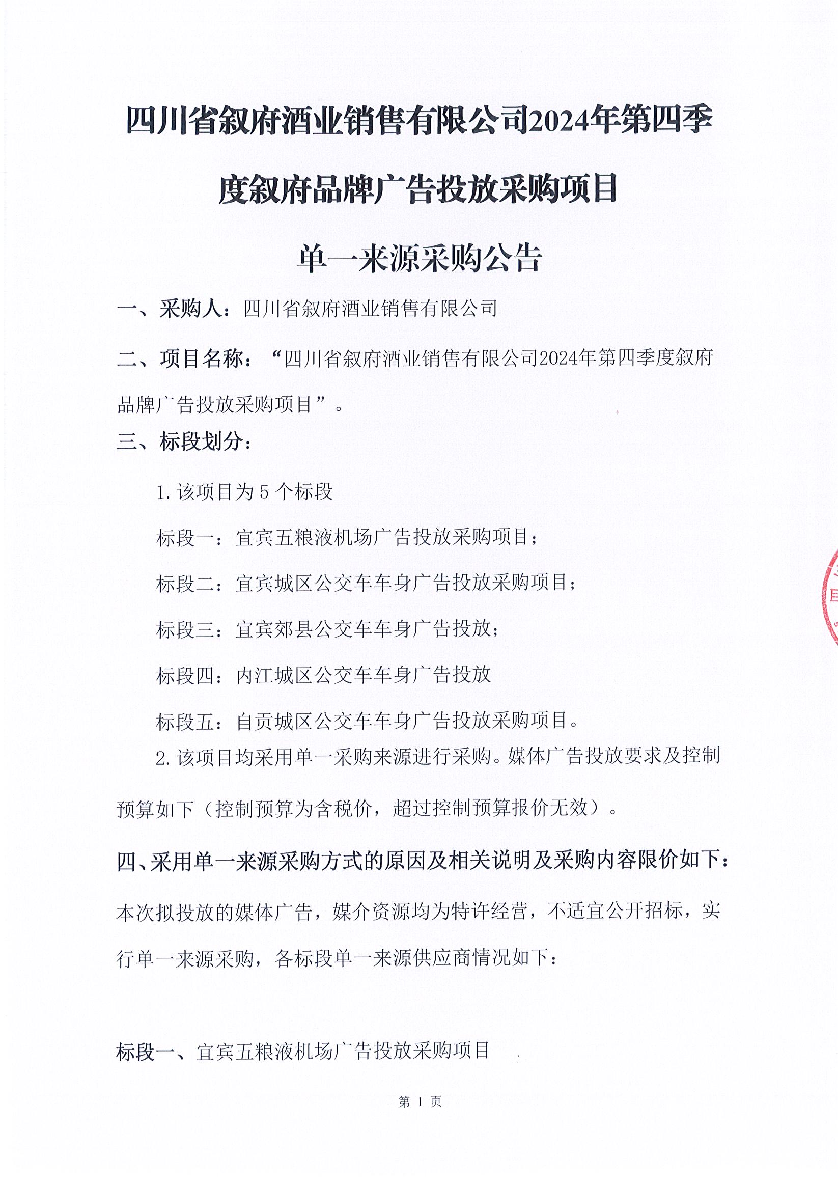 四川省敘府酒業(yè)銷售有限公司2024年第四季度敘府品牌廣告投放單一來(lái)源采購(gòu)公示公告