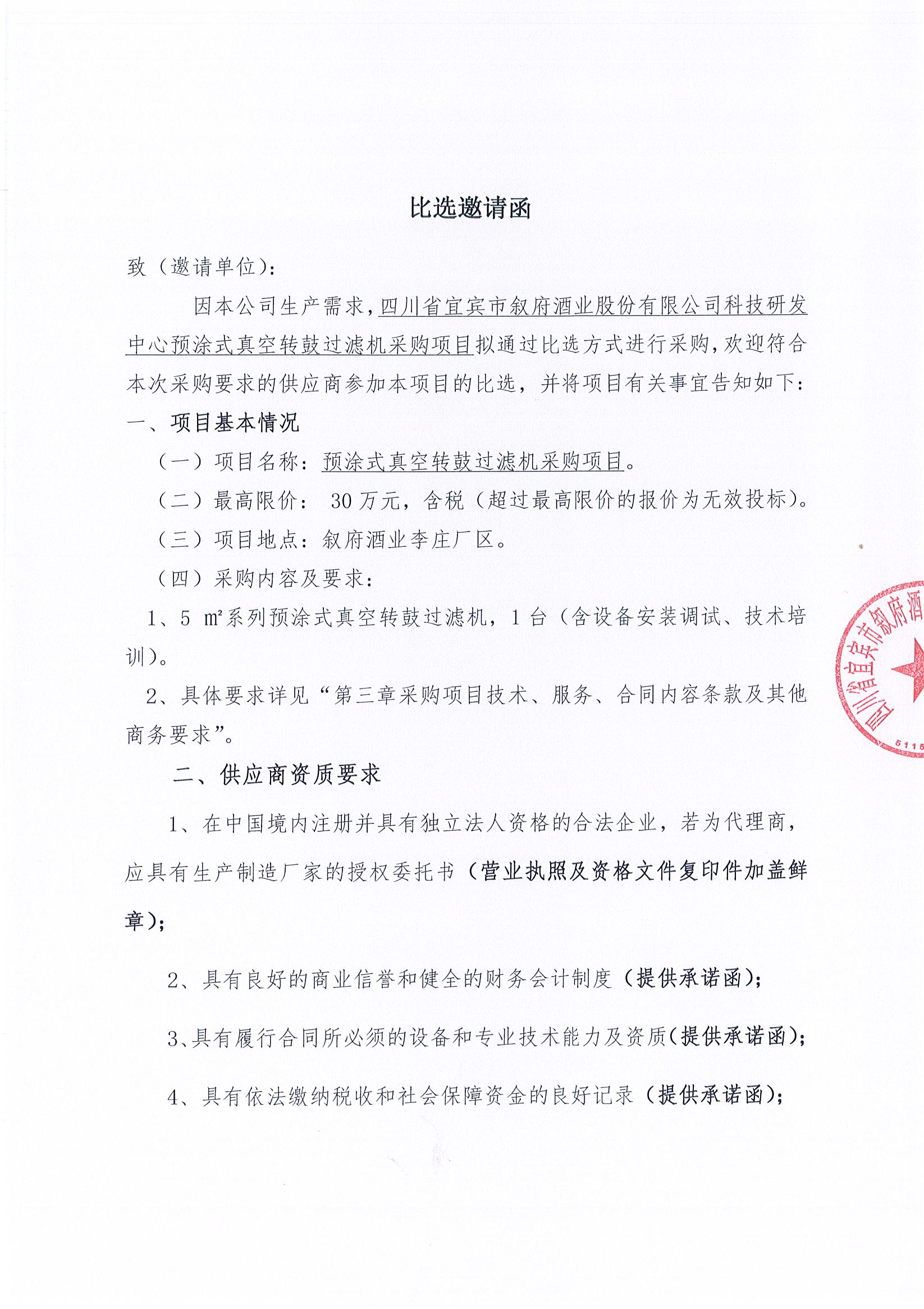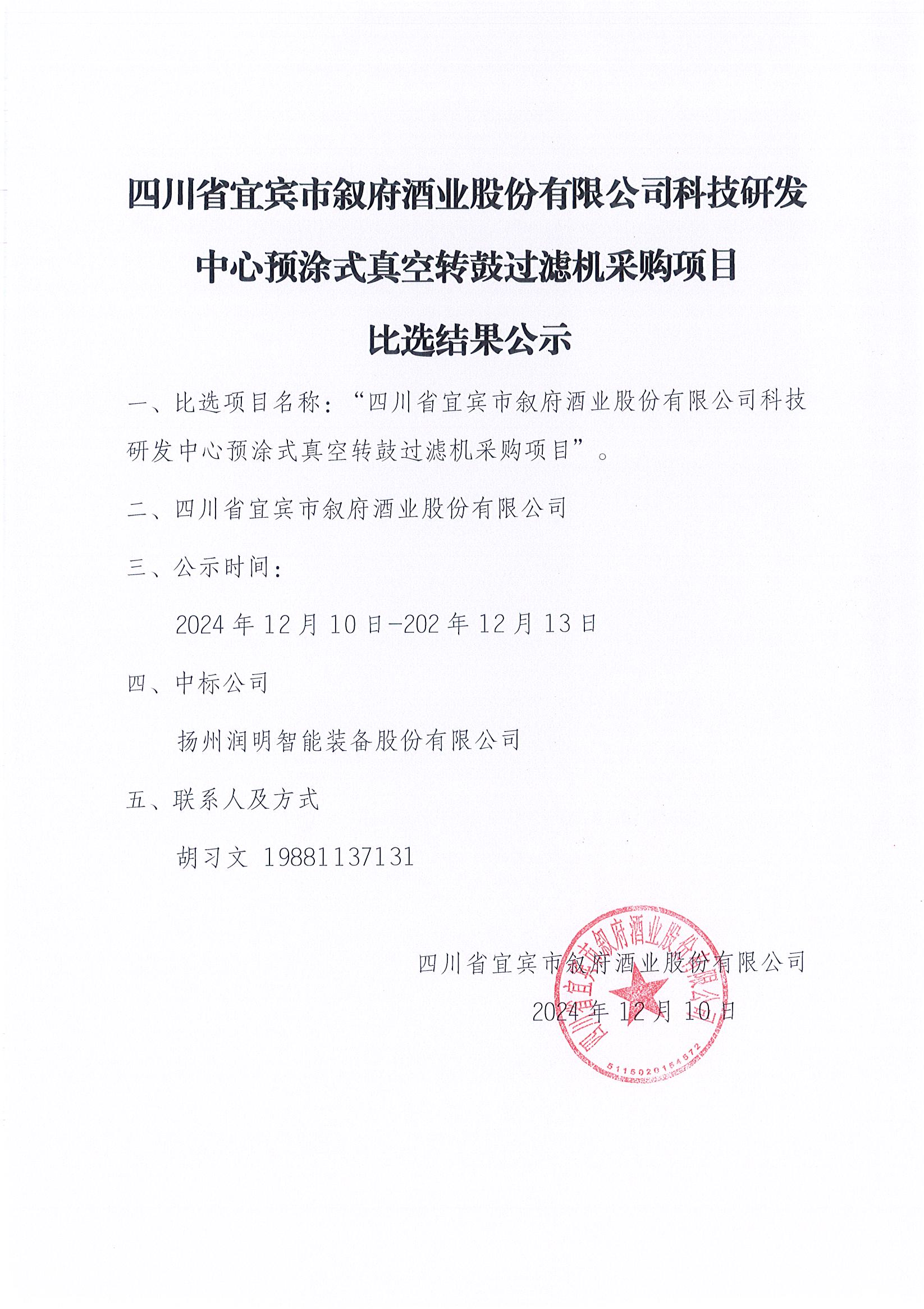 四川省宜賓市敘府酒業(yè)股份有限公司科技研發(fā)中心預(yù)涂式真空轉(zhuǎn)鼓過(guò)濾機(jī)采購(gòu)項(xiàng)目比選公示公告
