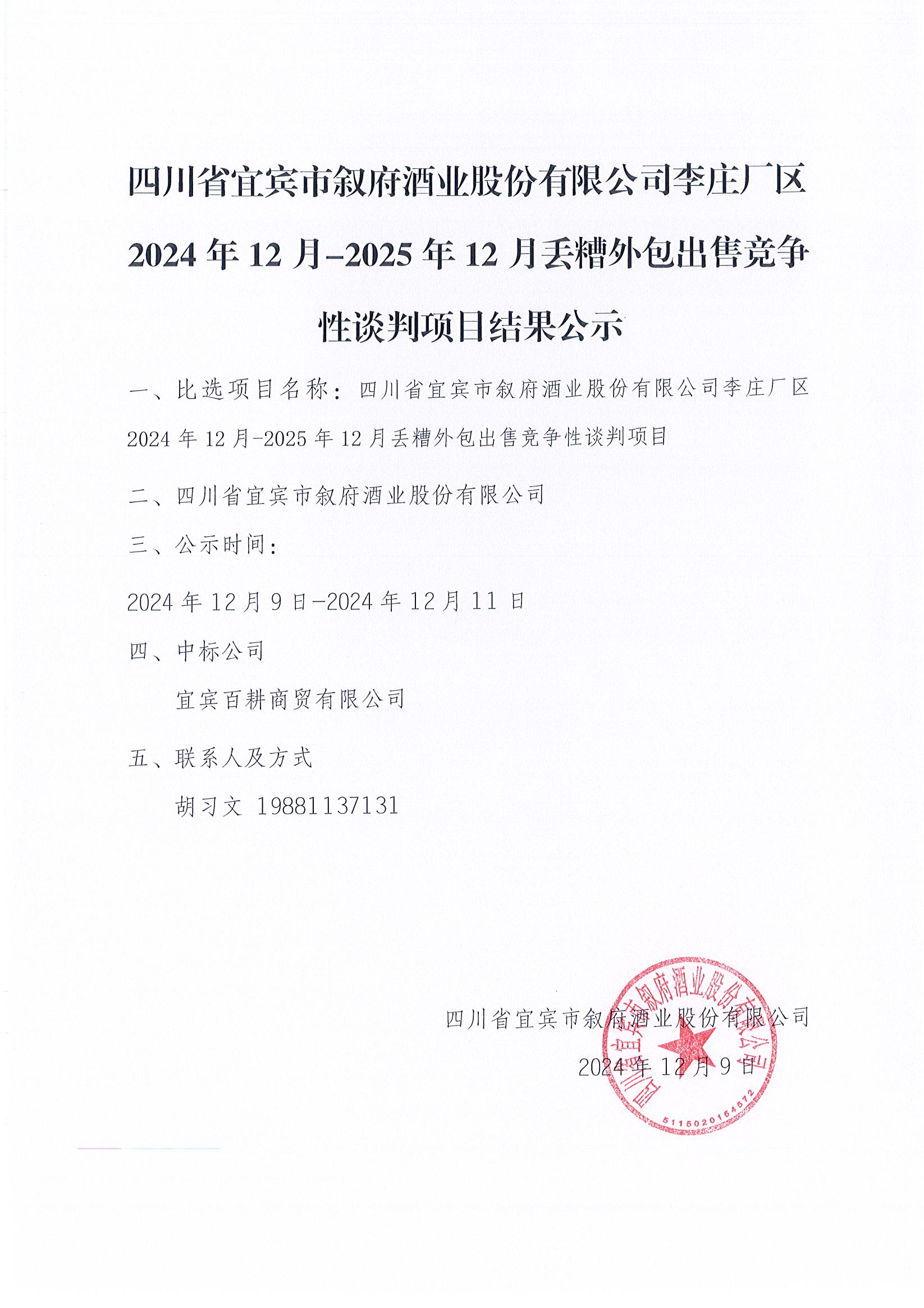 四川省宜賓市敘府酒業(yè)股份有限公司李莊廠區(qū)2024年12月-2025年12月丟糟外包出售競(jìng)爭(zhēng)性談判項(xiàng)目結(jié)果公示