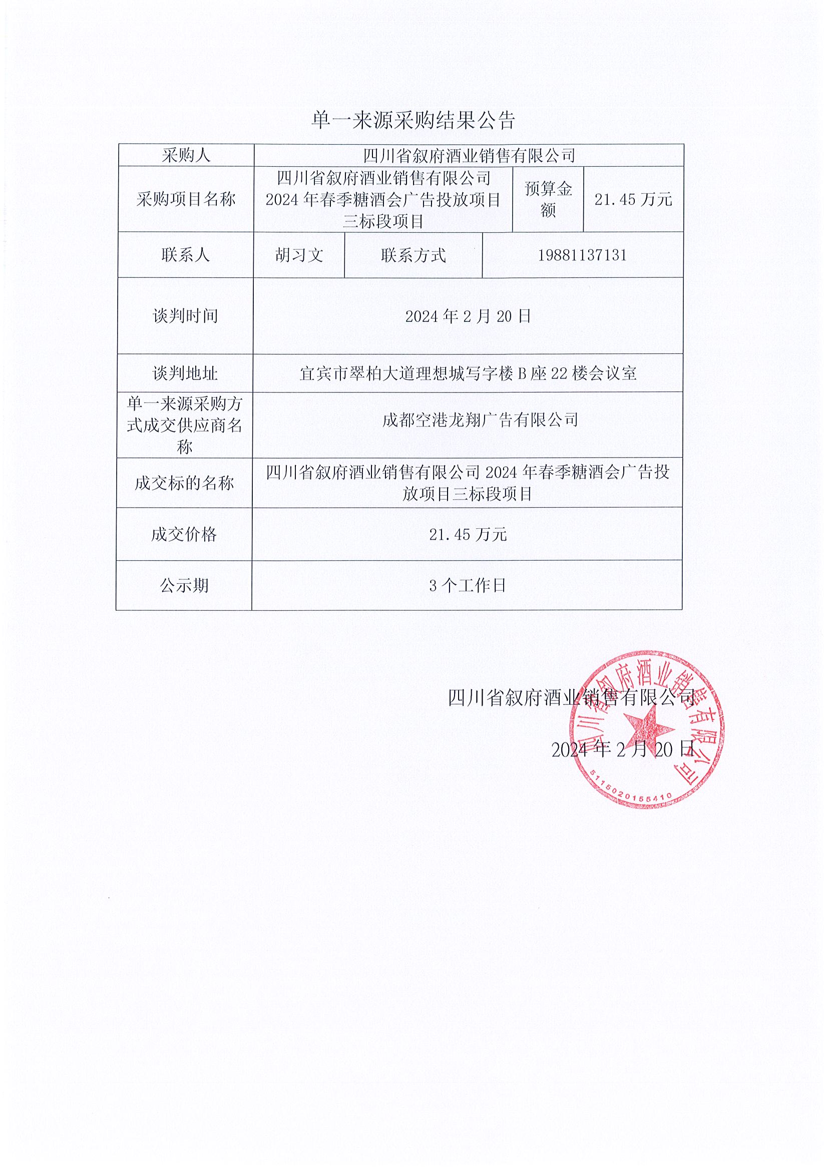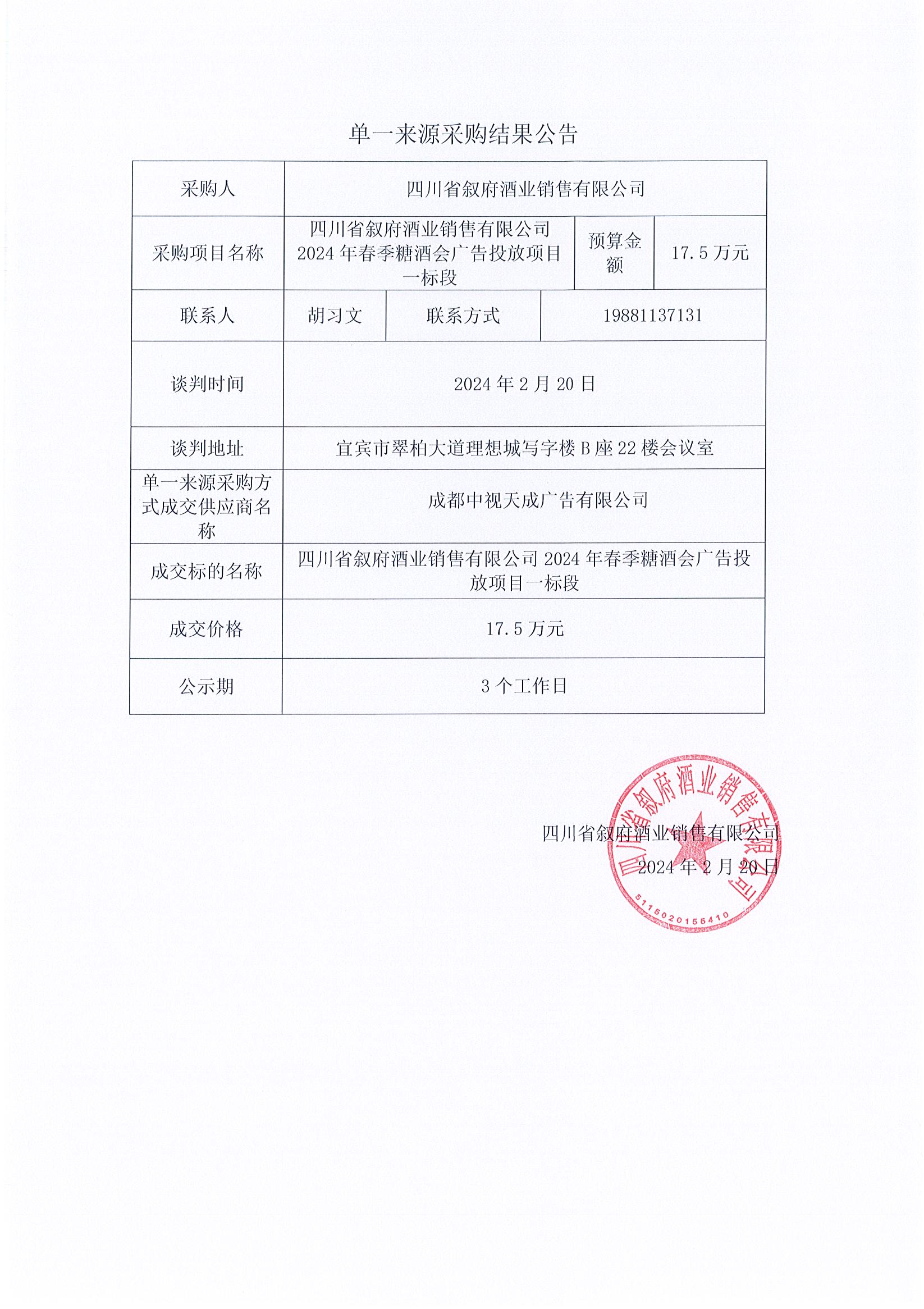 四川省敘府酒業(yè)銷售有限公司2024年春季糖酒會(huì)場地設(shè)計(jì)搭建服務(wù)采購項(xiàng)目中標(biāo)結(jié)果公示公告