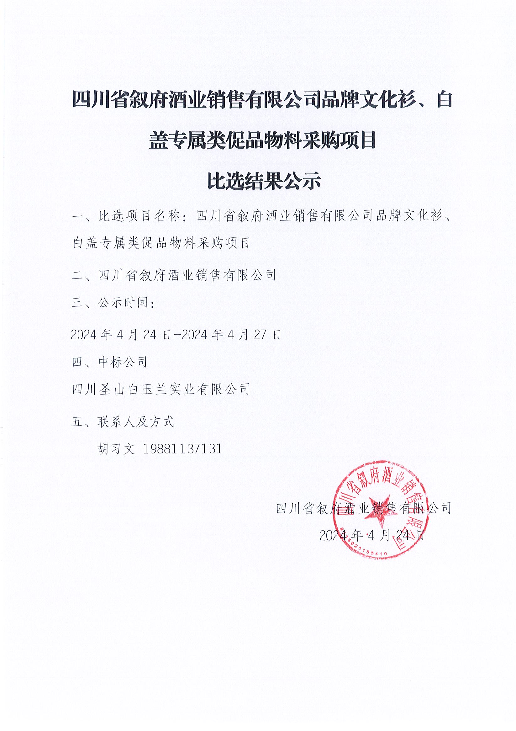 (第二次)四川省敘府酒業(yè)銷售有限公司2024年自營中高端價位產(chǎn)品設(shè)計服務(wù)采購項(xiàng)目中標(biāo)結(jié)果公示公告