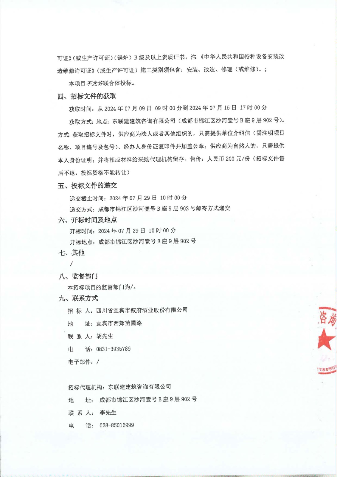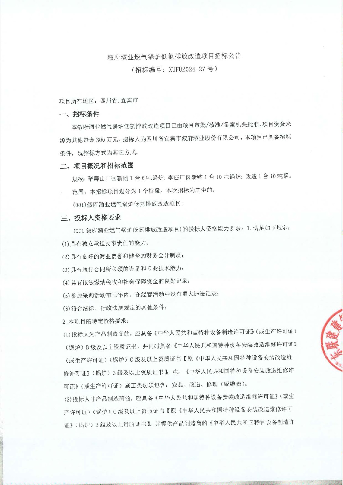 四川省宜賓市敘府酒業(yè)股份有限公司燃?xì)忮仩t低氮排放改造項(xiàng)目更正公告
