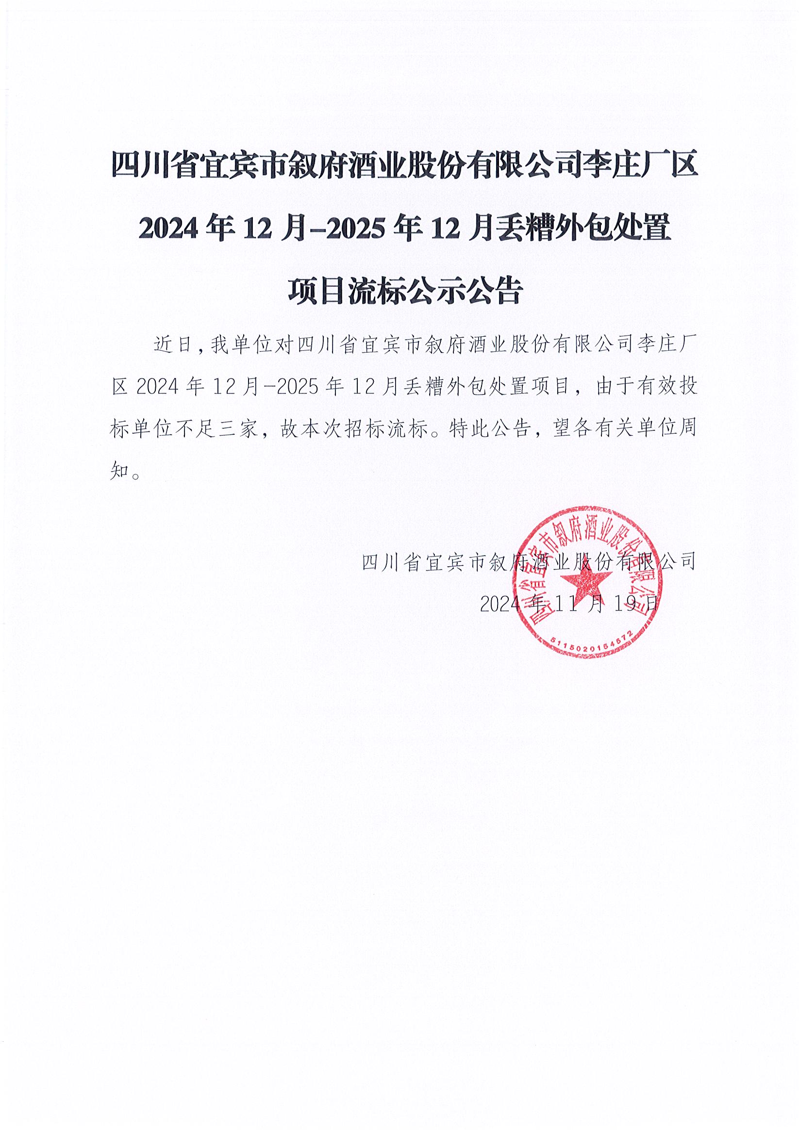 四川省宜賓市敘府酒業(yè)股份有限公司李莊廠區(qū)包裝中心酒罐區(qū)建設(shè)采購項目招標(biāo)公示公告
