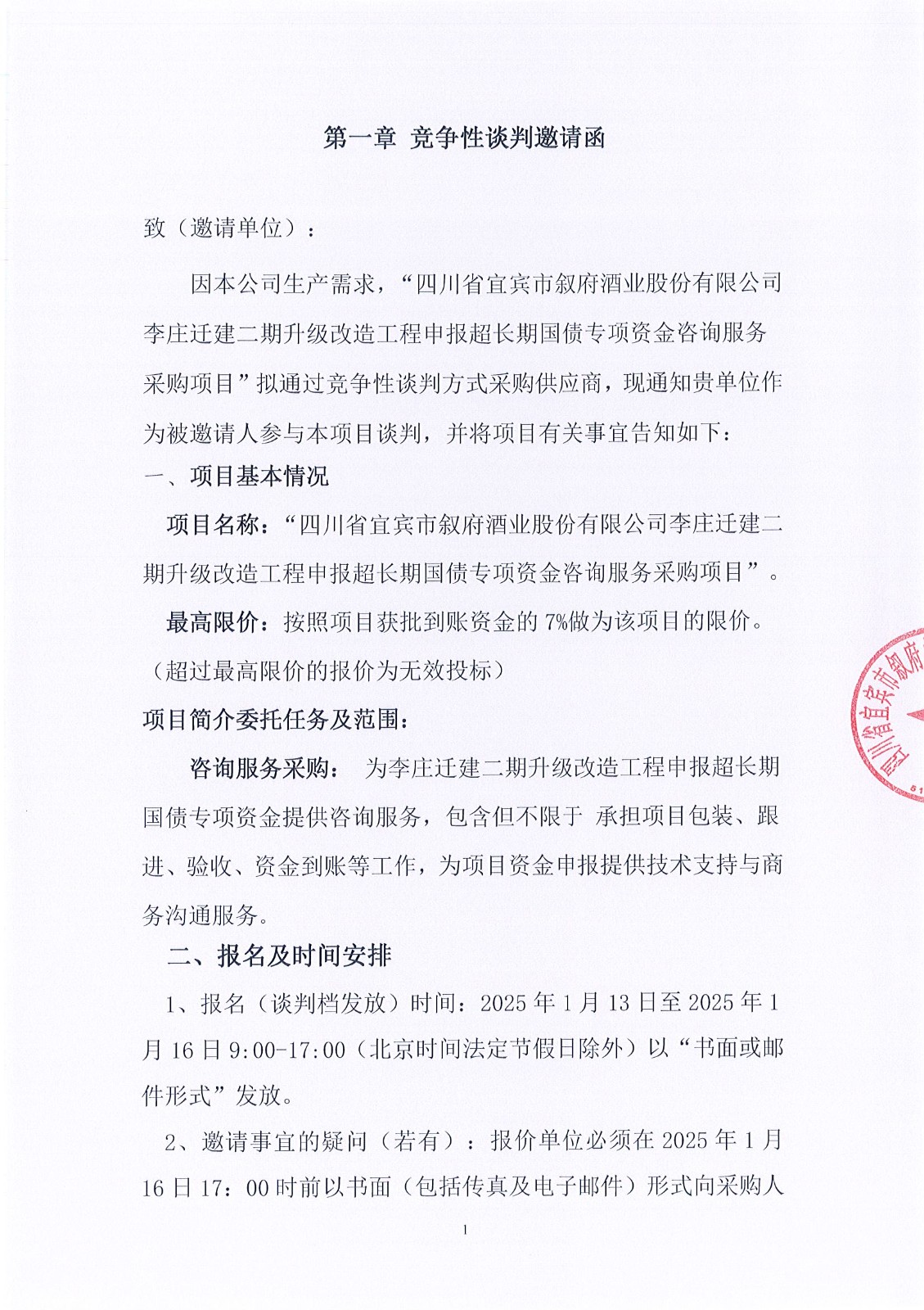 四川省宜賓市敘府酒業(yè)股份有限公司李莊遷建二期升級(jí)改造工程申報(bào)超長(zhǎng)期國(guó)債專項(xiàng)資金咨詢服務(wù)采購(gòu)項(xiàng)目競(jìng)爭(zhēng)性談判公示公告