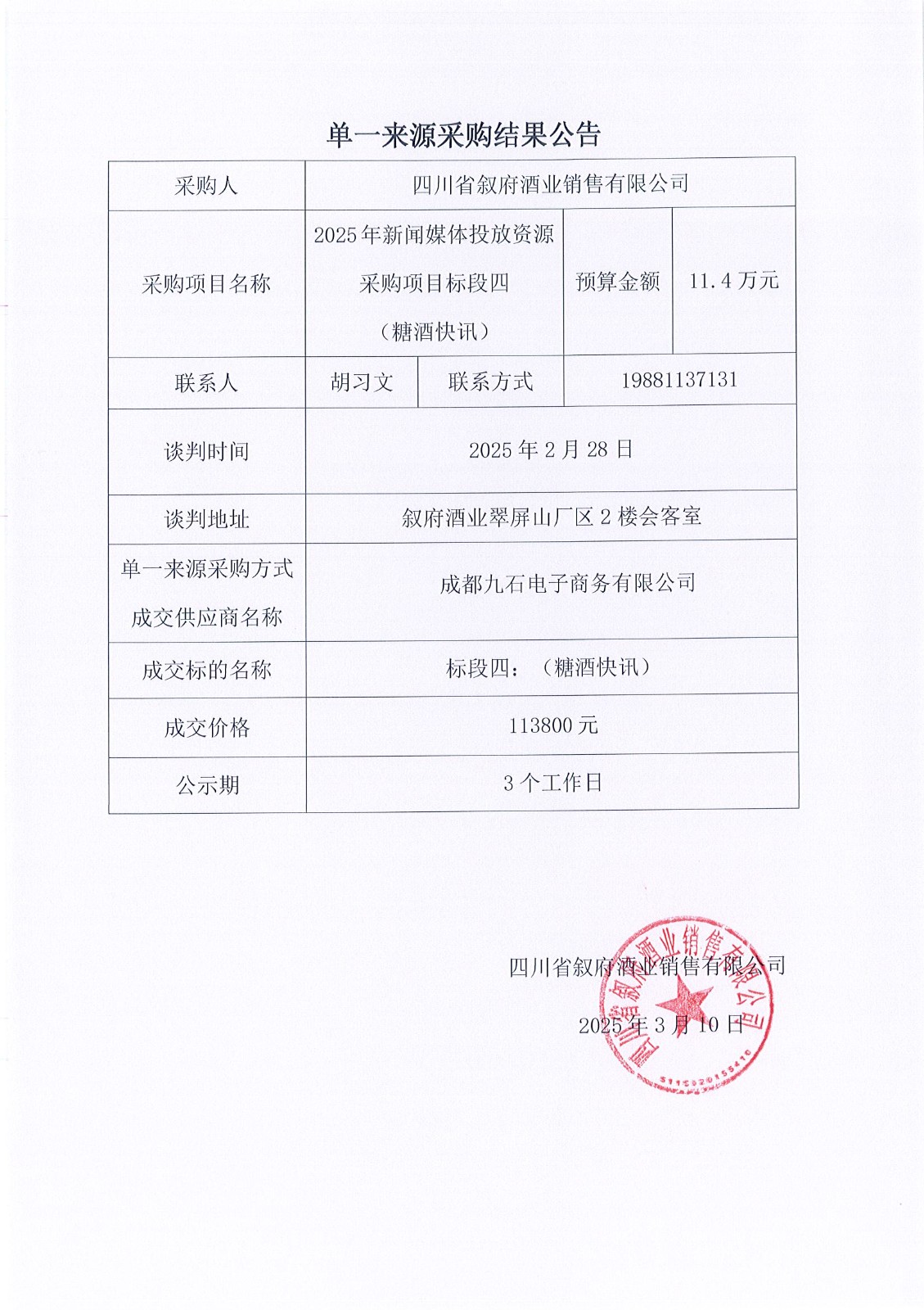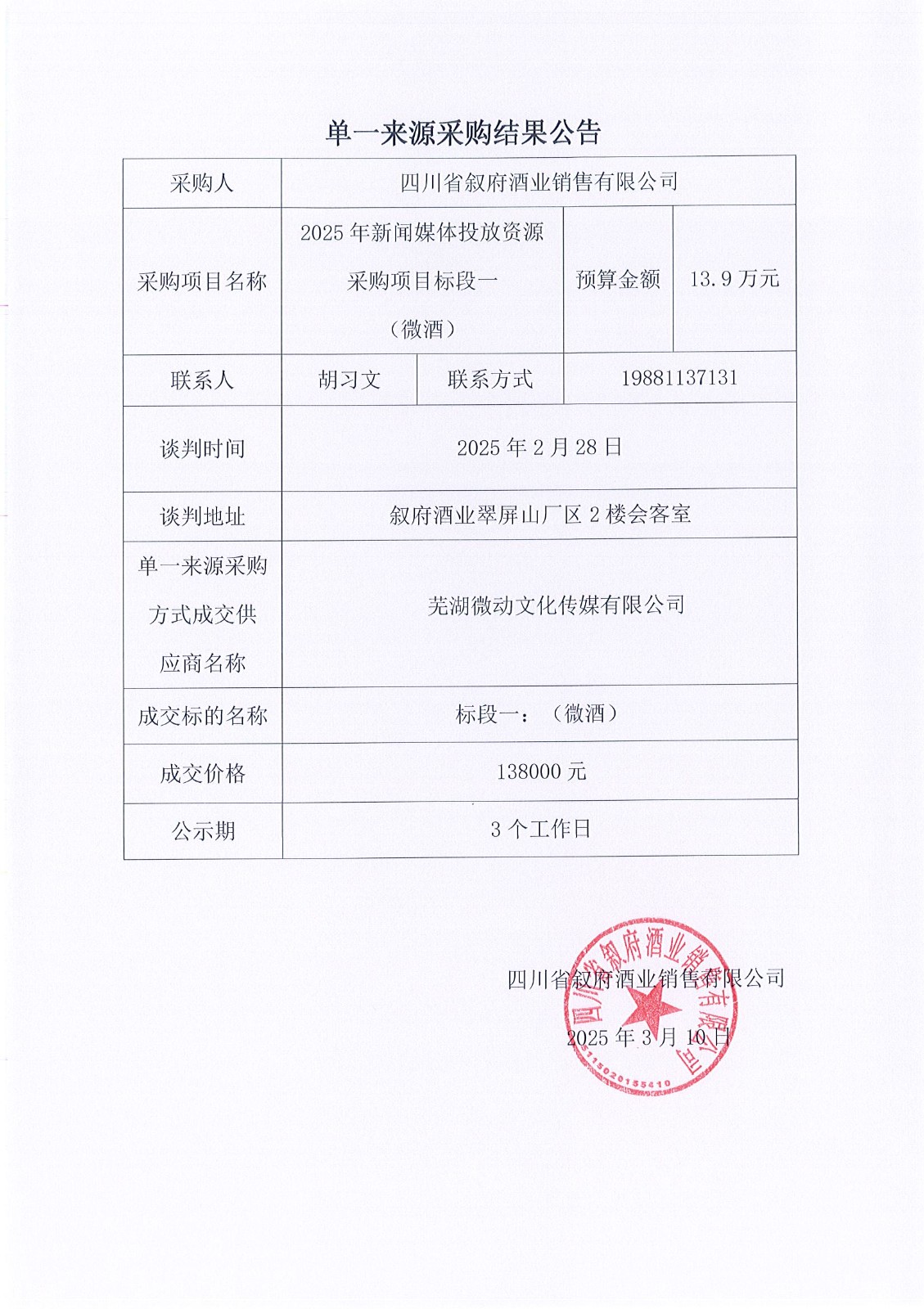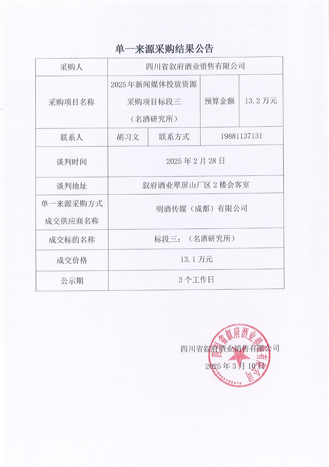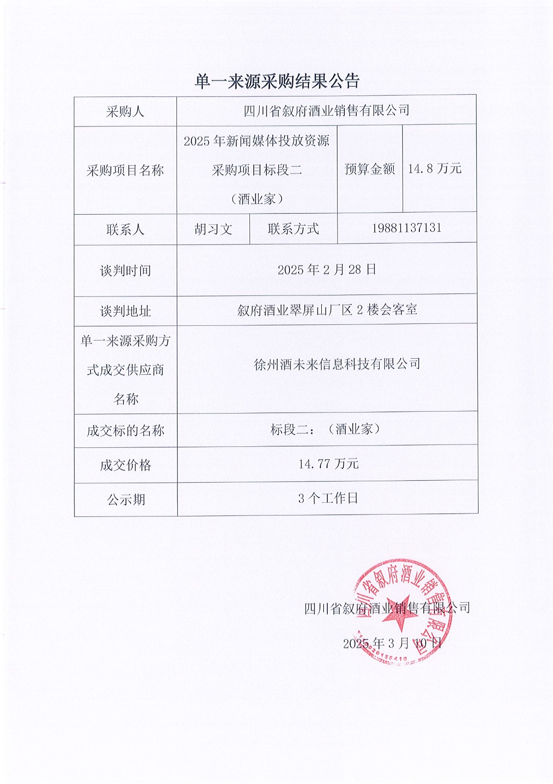 四川省敘府酒業(yè)銷(xiāo)售有限公司敘府大曲(藍(lán)標(biāo))產(chǎn)品TVC的創(chuàng)作與拍攝采購(gòu)項(xiàng)目中標(biāo)結(jié)果公示公告