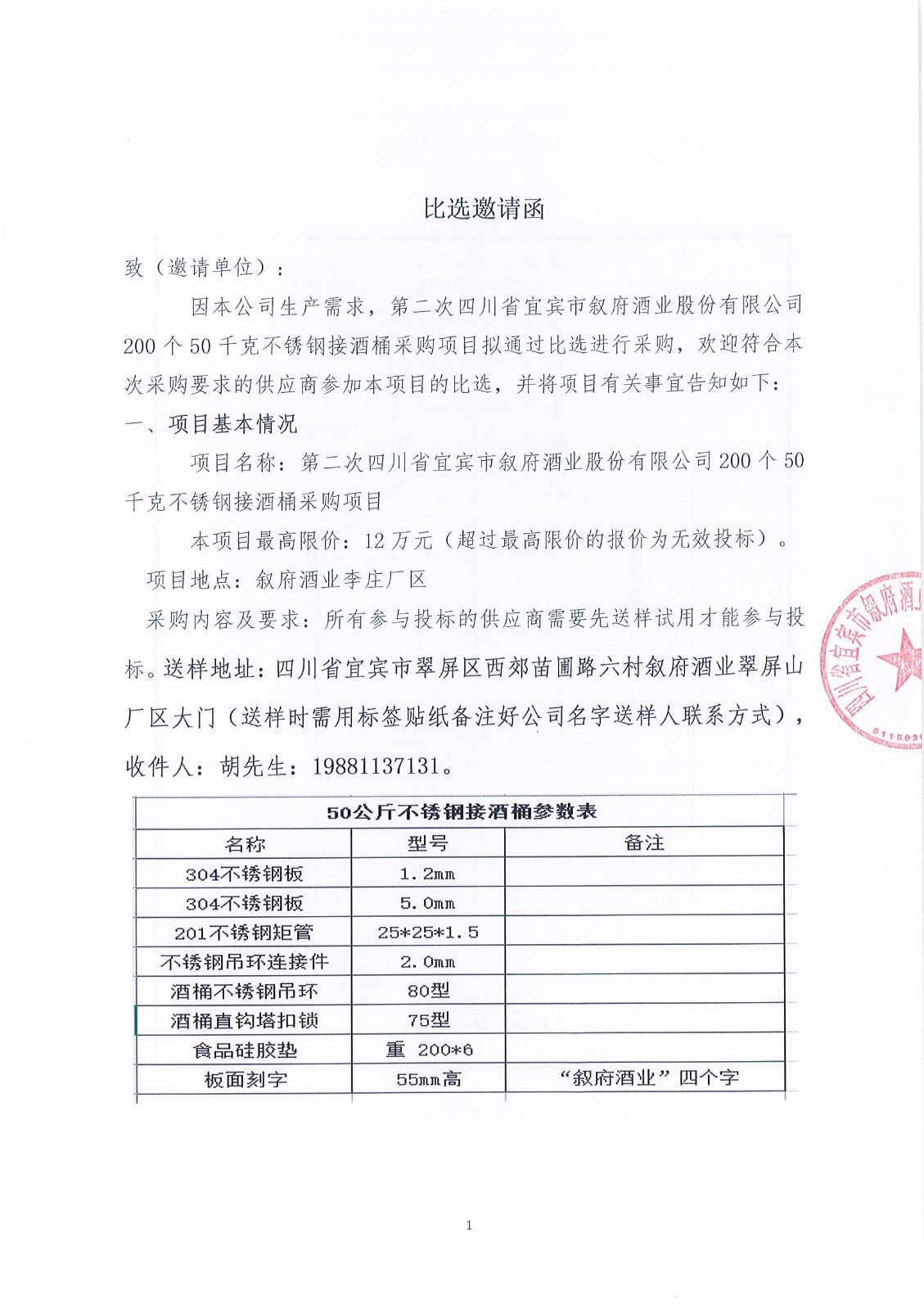 四川省宜賓市敘府酒業(yè)股份有限公司200個50千克不銹鋼接酒桶采購項目流標(biāo)公示公告
