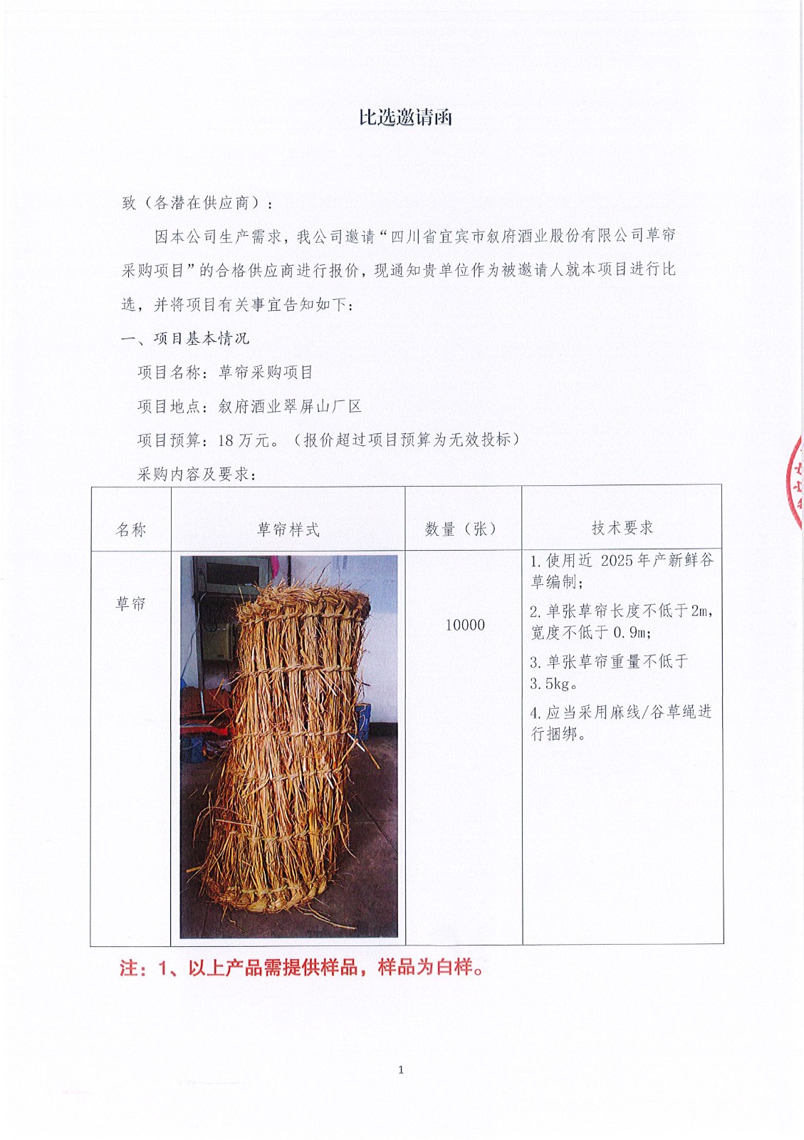 四川省宜賓市敘府酒業(yè)股份有限公司翠屏山廠2025-2026年度丟糟出售采購(gòu)項(xiàng)目競(jìng)價(jià)公告