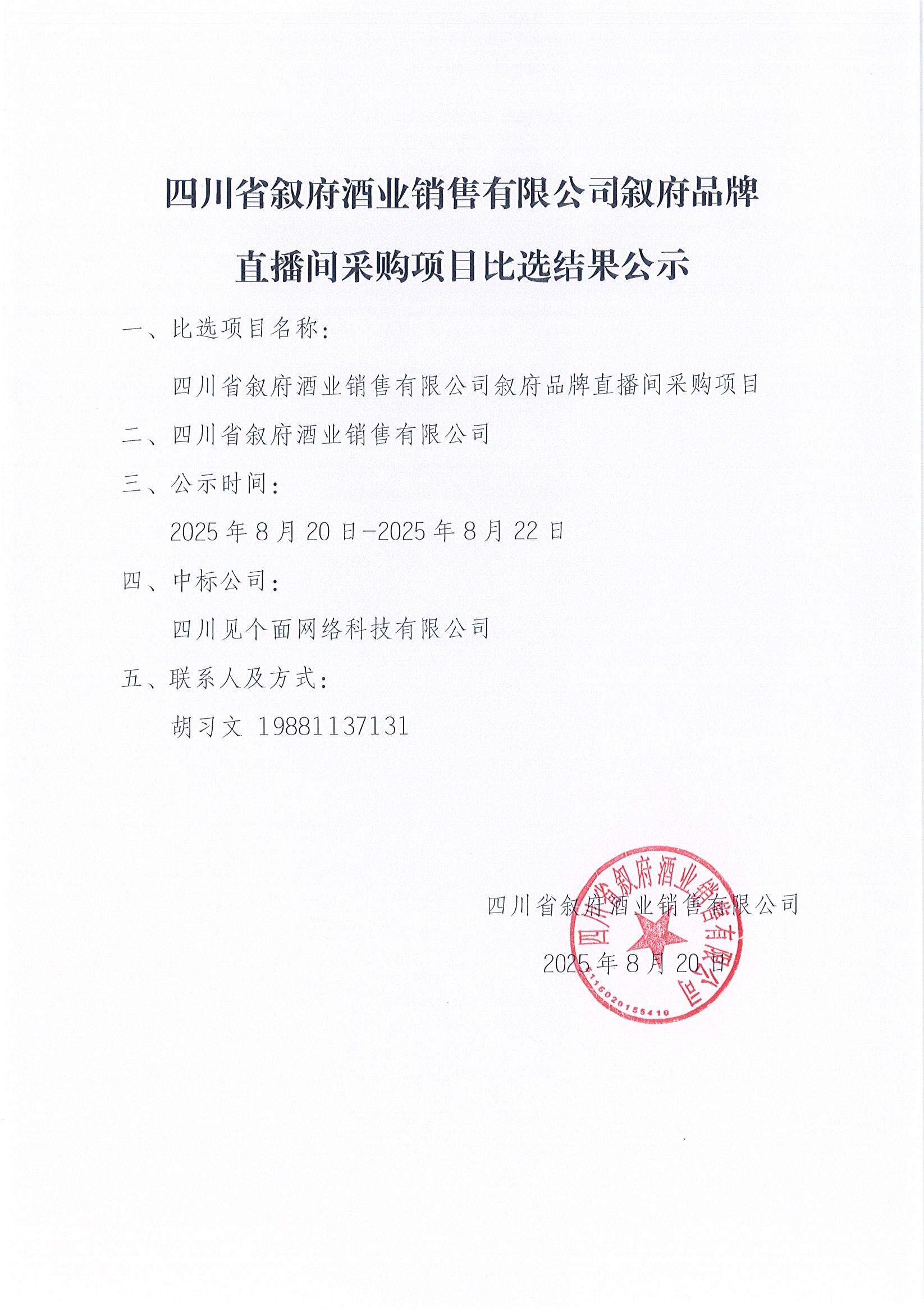 四川省敘府酒業(yè)銷售有限公司敘府大曲(藍標)產品TVC的創(chuàng)作與拍攝采購項目中標結果公示公告