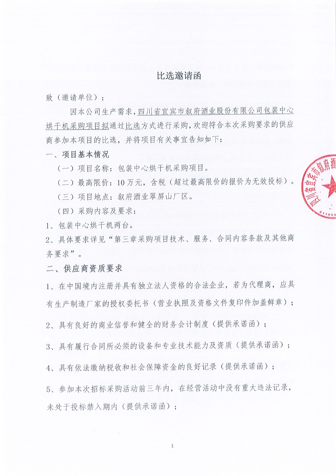 (第二次)四川省宜賓市敘府酒業(yè)股份有限公司包裝中心烘干機(jī)采購(gòu)項(xiàng)目比選招標(biāo)公告