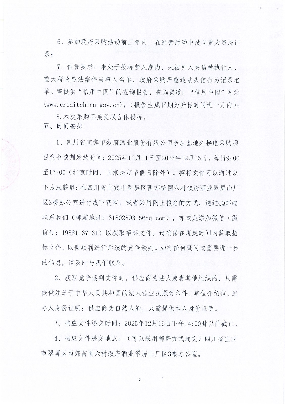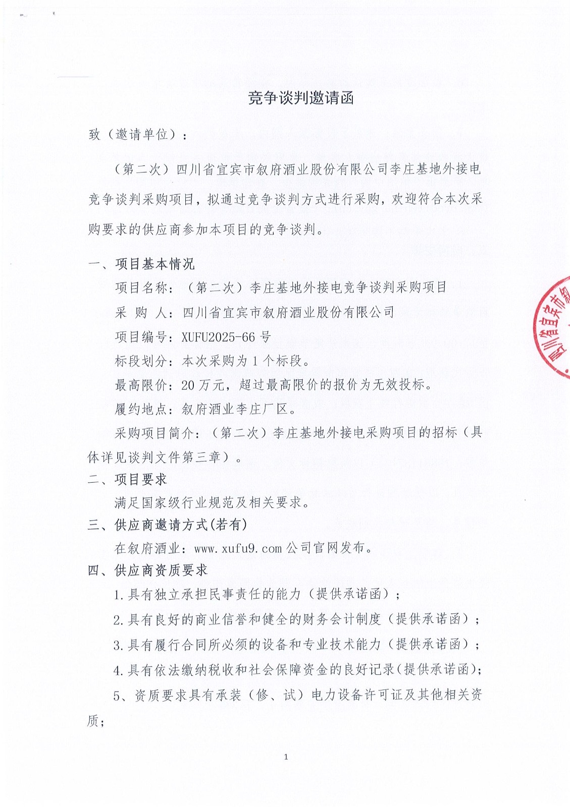 四川省宜賓市敘府酒業(yè)股份有限公司李莊基地外接電競(jìng)爭(zhēng)談判采購(gòu)項(xiàng)目流標(biāo)公示公告